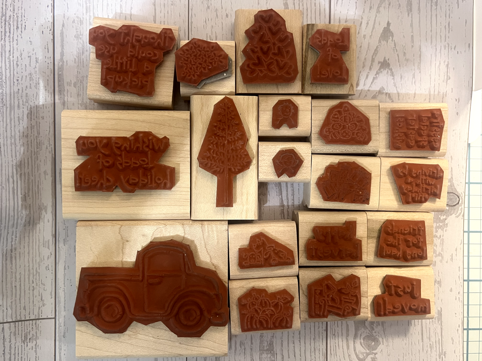 Durable rubber and wood stamps ideal for crafts, scrapbooking, and card making. Gently used condition with versatile designs for creative projects. • Includes truck and coordinating accessory stamps • Wood-mounted for durability • Gently used, clean surfaces • Suitable for various DIY projects • Easy-to-handle sizes Minor wear on wood; rubber in great condition. (See photos) Items are from a smoke-free, pet-friendly home, and are stored with care in a clean environment. Orders are packed securely and shipped promptly. I’m happy to answer questions—thank you for supporting my small shop. .