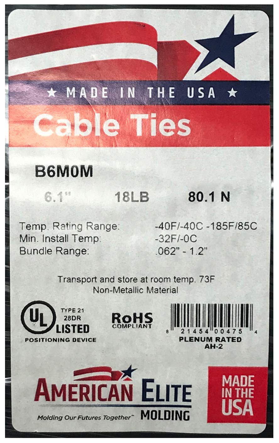 Sherco Automotive & Marine Supplies Part # CT6B-1000 Standard Black 6" Inch Cable Zip Ties 18 lbs - 1000 Pack - Made in the USA American Elite branded cable ties are manufactured using virgin nylon 6/6 to guarantee superior quality throughout the manufacturing process. Standard Black 6" Inch Cable Zip Ties - 1000 Pack Tensile Strength - 18 lbs Temperature Rating Range: Max Install Temp ( -40 to 85 Degrees C or -40 to 185 Degrees F) - Min. Install Temp ( -0 Degrees C or -32 Degrees F ) Made in the USA. UL Listed - RoHS Compliant American Elite branded cable ties are manufactured using virgin nylon 6/6 to guarantee superior quality throughout the manufacturing process. Standard Black 6" Inch Cable Zip Ties UV Resistant Wire Wrap - 1000 Pack Tensile Strength - 18 lbs Temperature Rating Range: Max Install Temp ( -40 to 85 Degrees C or -40 to 185 Degrees F) - Min. Install Temp ( -0 Degrees C or -32 Degrees F ) Made in the USA. UL Listed - RoHS Compliant