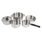 Our eBay Store Stoves Propane Appliances Cookware Lighting Tents Sleeping More! Stansport Heavy Duty - Stainless Steel Clad Cook Set Ranging in size from 1-quart to 4-quarts, the four pots make outdoor cooking a breeze for groups of all sizes. Also included is a 10” fry pan, perfect for omelets and stir fries. The universal lid covers each item for simmering soups and stews. The universal handle is interchangeable with all but the 4-quart pot, which has its own handles. All of the items nest together for easy carrying and storage of the entire set. Set Includes: 4 qt. Pot, 3 qt. Pot, 2 qt. Pot, 1 qt. Pot, 9.75” Frypan, 8.75” Universal Lid and Universal Handle. Made from kitchen quality 18/10 stainless steel Triple-Ply 2.0mm Aluminum Clad bottom for superior conductivity and even heating Detachable "Cool" handle can be used on all pots and fry pan Easy to clean Fully nests together Product Details Color Stainless Steel Height 10.500 Length 10.750 UPC 011319403796 Our eBay Store About Us Contact Us Add to Favorite Sellers