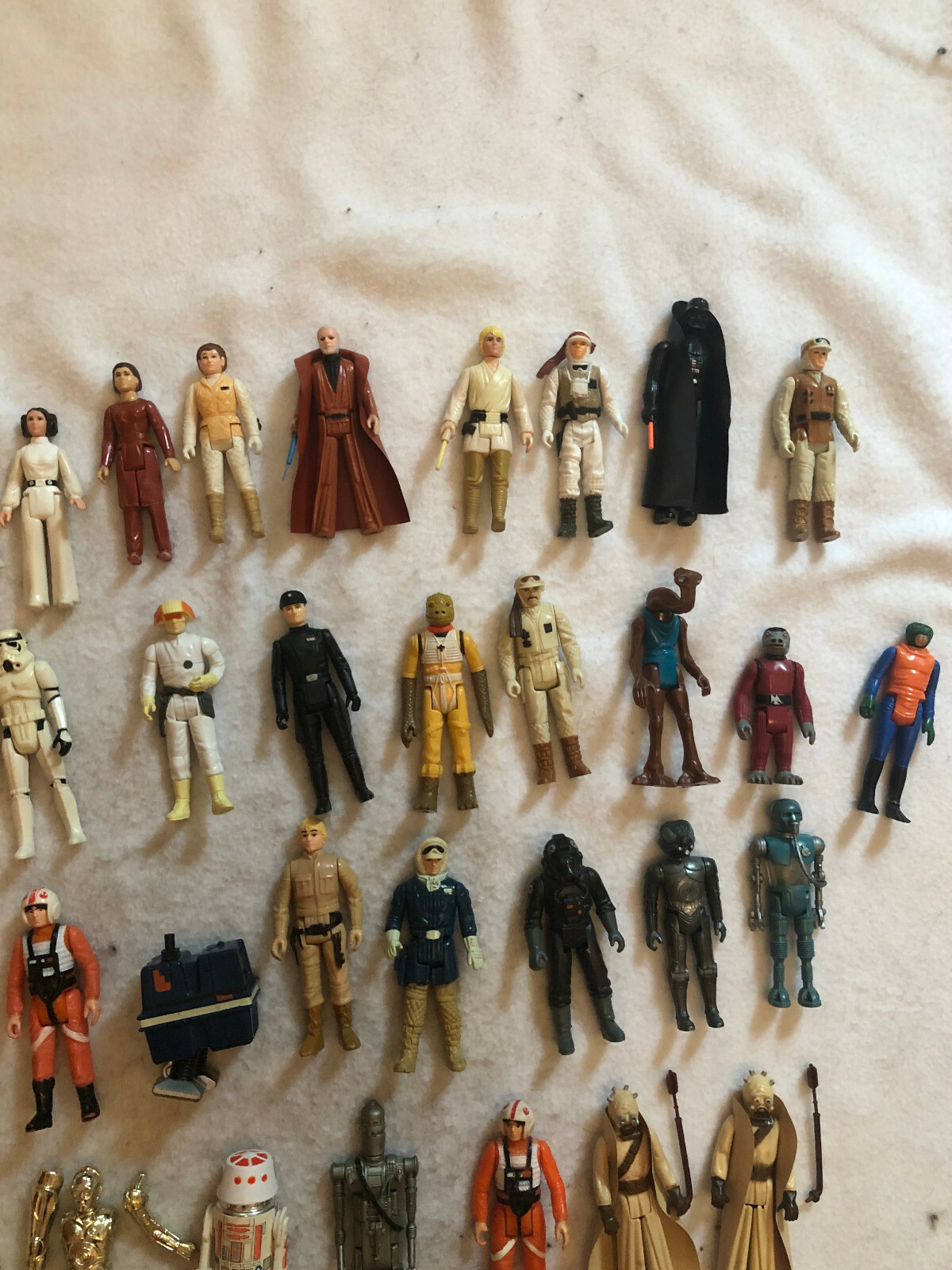 Vintage Star Wars 55 Figure Lot & Original Darth Vader Case & ESB Case Guns, etc Please feel free to ask me any questions. I will do my best to answer. If you want close-ups of a certain figure...hit me. All figures are original and purchased back in the 70s and 80s when I was a youngin'. After Empire, I stopped playing/collecting Star Wars figures and put all of these babies in storage. Please ignore name labels as they do not match the figures in the cases. Please fellow nerd, no need to write me, "Hey, why is Obi-Wan in Boba Fett's spot?" Ha! You know you want to... Look over the figures as there are some repeats. Leia is missing her vinyl robe. I found the Bespin Leia's robe. I believe all others are complete, fashionwise One R2 is the regular R2. The other is the R2 with sensorscope. One 3PO is regular. The other is the break apart 3PO from ESB (no back-pack thing) Yoda includes cane and bright orange snake (some say this snake is more rare than a brown snake) You get a total of 54 weapons/tools/etc. Original. No reproductions. Not sure if every figure has the weapon/tool it came with. The Vader case is in great shape. All three clips are intact and work. Vinyl case is in great shape. There is a 3-4 inch separation in the cover/body fold along the middle. Top is still intact and operates as designed. Also included are what's left of the original name labels. Has always been in a smoke free home ! What you see pictured is the item you’ll receive. Selling as is. No Returns. Comes from a smoke free home. What you see pictured is the item you’ll receive. Shipping is calculated based on your location by The USPS Ground. Check out my other auctions! Thanks and Cheers.