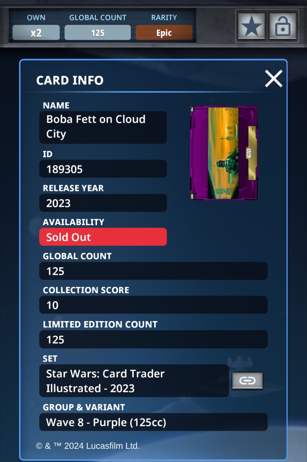 Topps Star Wars Card Trader 2023 Card Trader Illustrated Wave 8 Epic Purple CTI Boba Fett on Cloud City 125cc Limited Edition This is a digital card. Please include Swct IGN with purchase. We do not sell to new accounts or accounts with poor trade ratings.