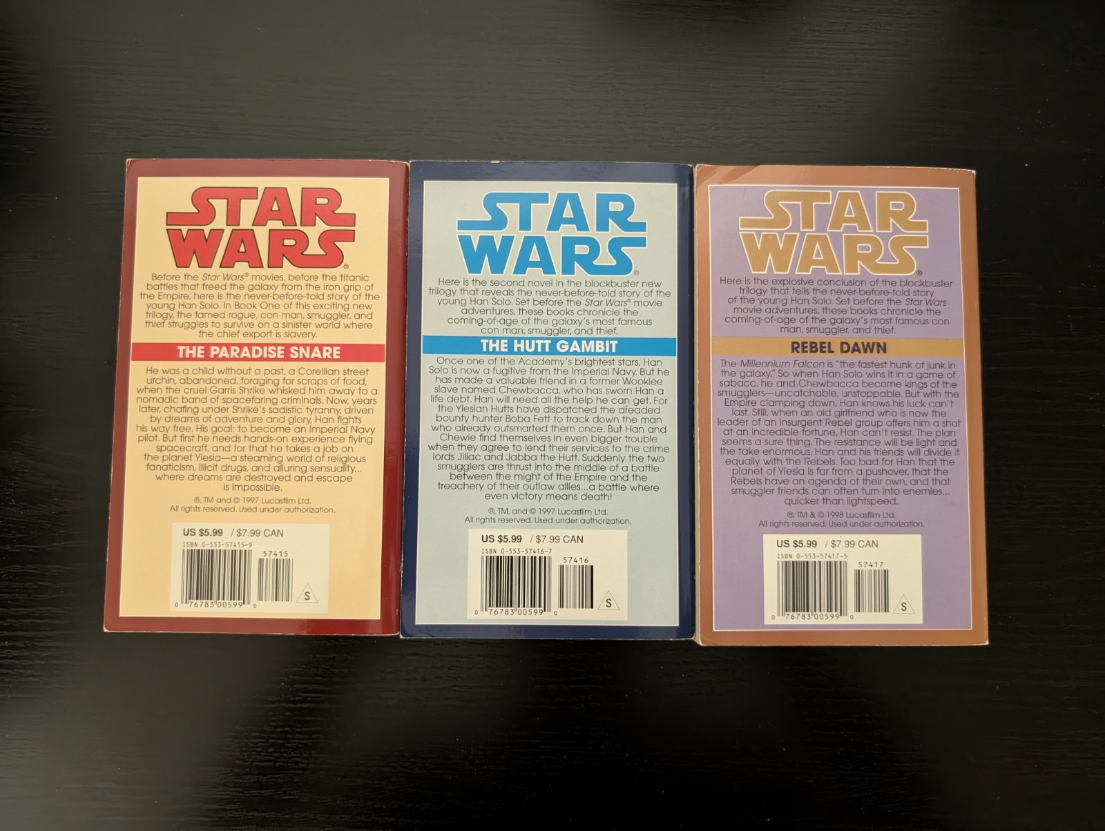 Item Width:4.2 ineBay Product ID (ePID):1034757Language:EnglishBook Title:Paradise Snare: Star Wars Legends (The Han Solo Trilogy)Format:Mass MarketItem Length:6.7 inPublisher:Random House Publishing GroupTopic:Science Fiction / Action & AdventureAuthor:A. C. CrispinPublication Year:1997Book Series:Star Wars: the Han Solo TrilogyNumber of Pages:320 PagesIntended Audience:AdultsNarrative Type:FictionItem Height:0.8 inGenre:Fiction