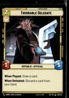 For sale is Star Wars Twilight of the Republic Favorable Delegate as seen in the picture. Please review all pictures and if you have any questions, please reach out to ask. Some card images are taken using a scanner so it may distort the image a little bit. Also please see my ebay store to see any possible ongoing promotions currently happening. Thanks and happy shopping.