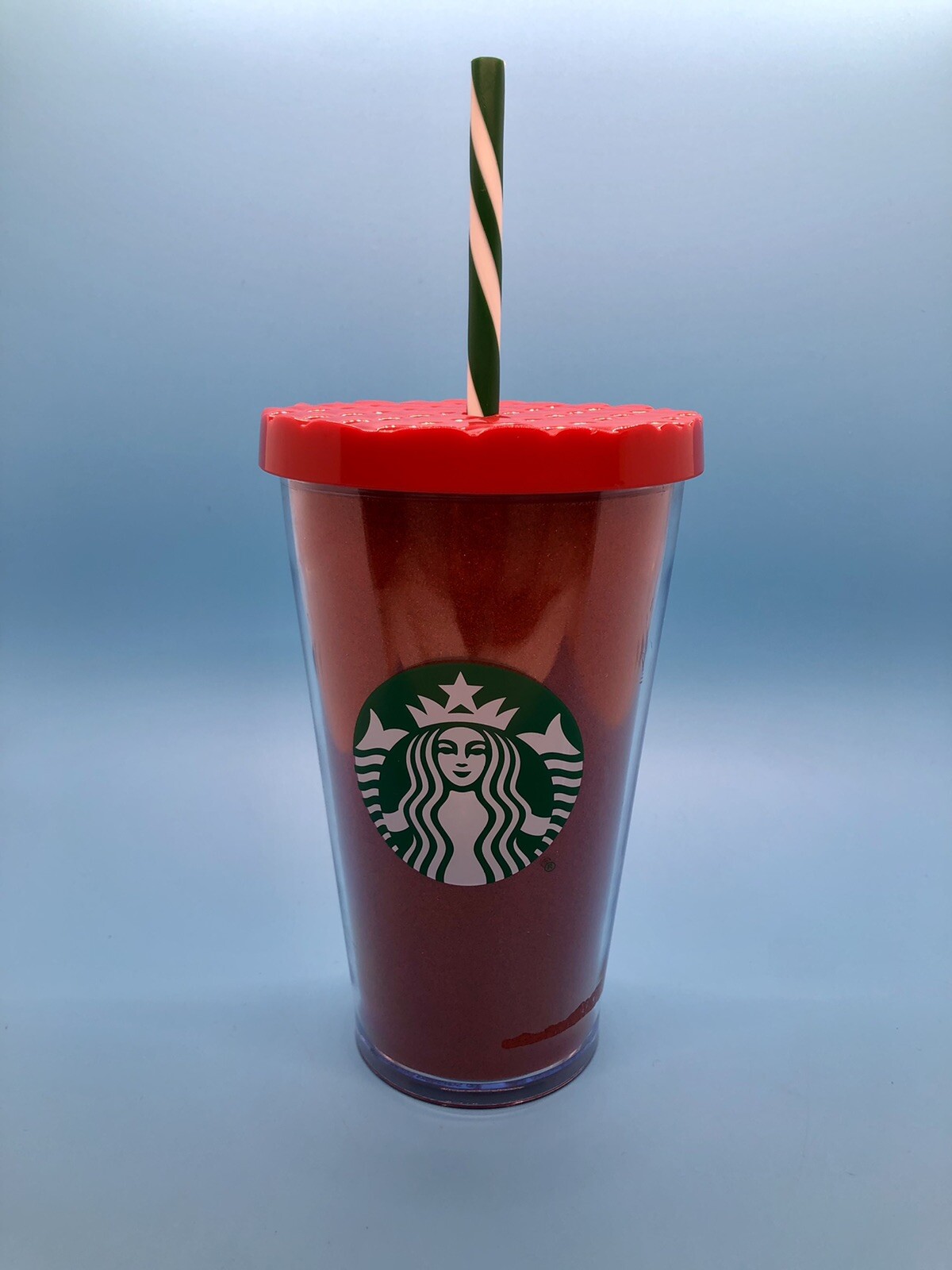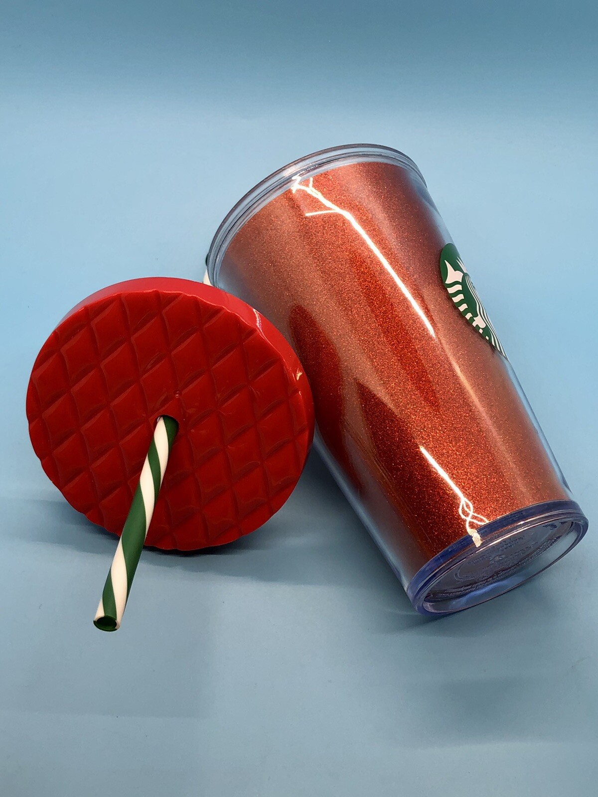 Starbucks 16 oz Ruby Red Sparkly Glitter Holiday Tumbler Waffle Top Green Straw Minor Imperfections Seen In Last Two Photos Please refer to the pictures for the quality and condition of this item, zooming in as necessary. X/4/X/X