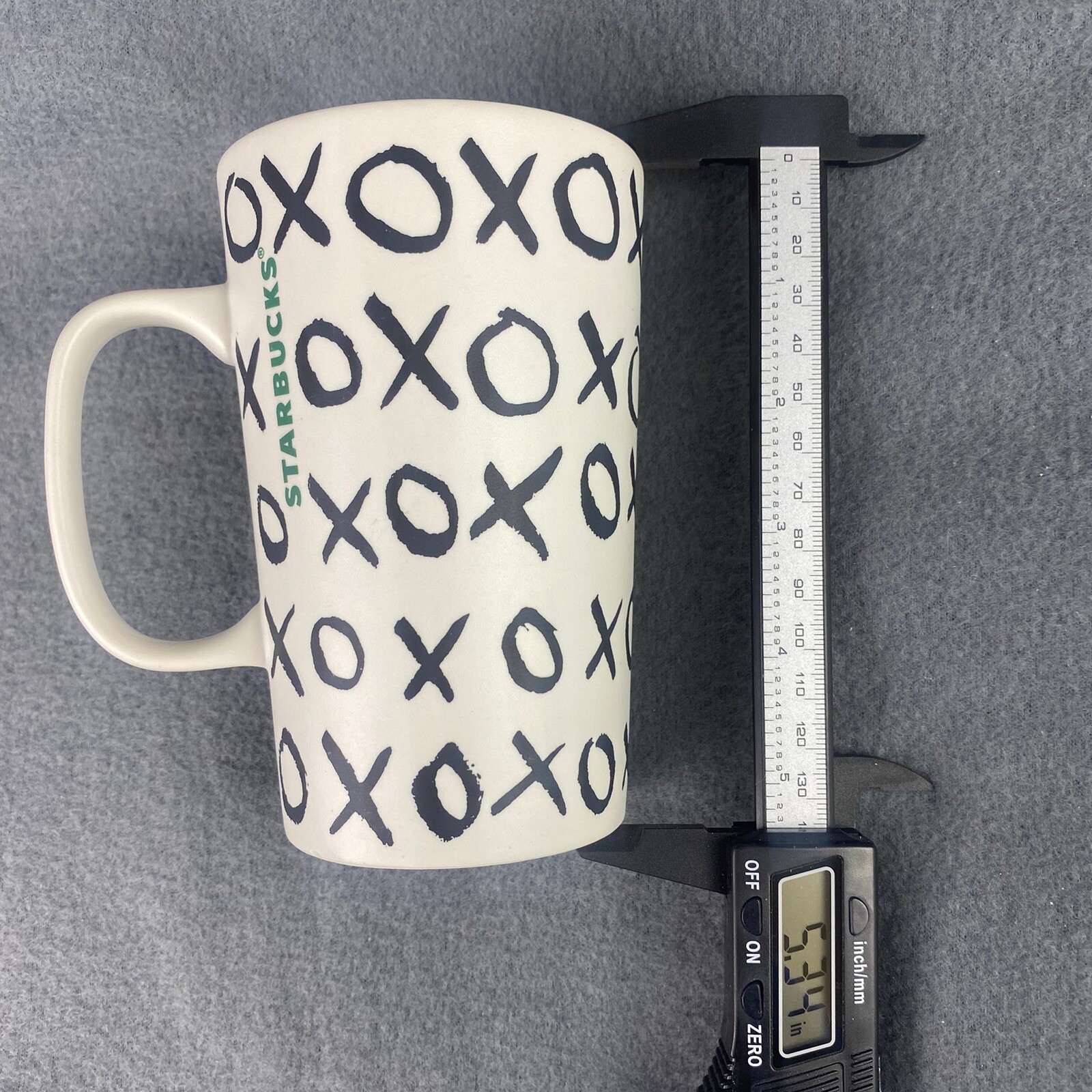 This Starbucks 2015 ceramic coffee mug features a white exterior with a black "XOXO" design and a green dot accent. It has a capacity of 16oz and is adorned with the iconic Starbucks name. Standing at a height of 5 3/8" (13.65cm), this original mug is perfect for coffee and tea enthusiasts. Made in Thailand, it is a collectible item for Starbucks fans and collectors alike.