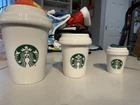 This set of three Starbucks ornaments is the perfect addition to any collection. Featuring the iconic Starbucks logo and nesting design, these ceramic cups are a must-have for coffee and tea enthusiasts alike. The green and white color scheme adds a touch of festive charm, making them a great choice for displaying during the holidays. Created in 2016 and originating from China, these ornaments are an original piece and have not been modified. They are featured under the Starbucks Ornament category and are perfect for collectors of Starbucks advertising memorabilia.