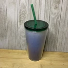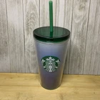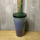 This Starbucks tumbler features a purple, blue, and green color scheme and includes a matching straw. With a 16 oz capacity, this plastic cold cup is designed for enjoying your favorite drinks on the go. Celebrating the coffee and tea theme, this collectible item showcases the Starbucks brand in a vibrant and eye-catching design for 2019.