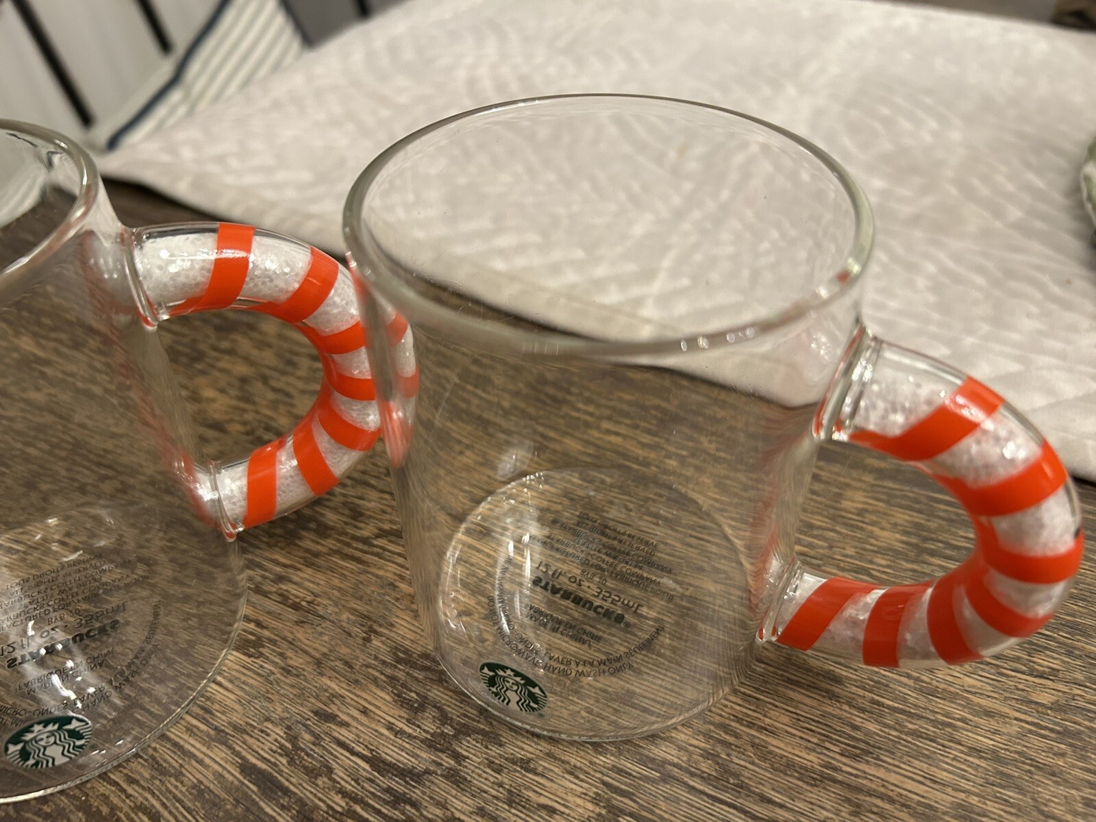 Get into the holiday spirit with this set of two Starbucks coffee cup mugs. Featuring a glittery candy cane design on clear glass. 12 oz mugs in new condition.
