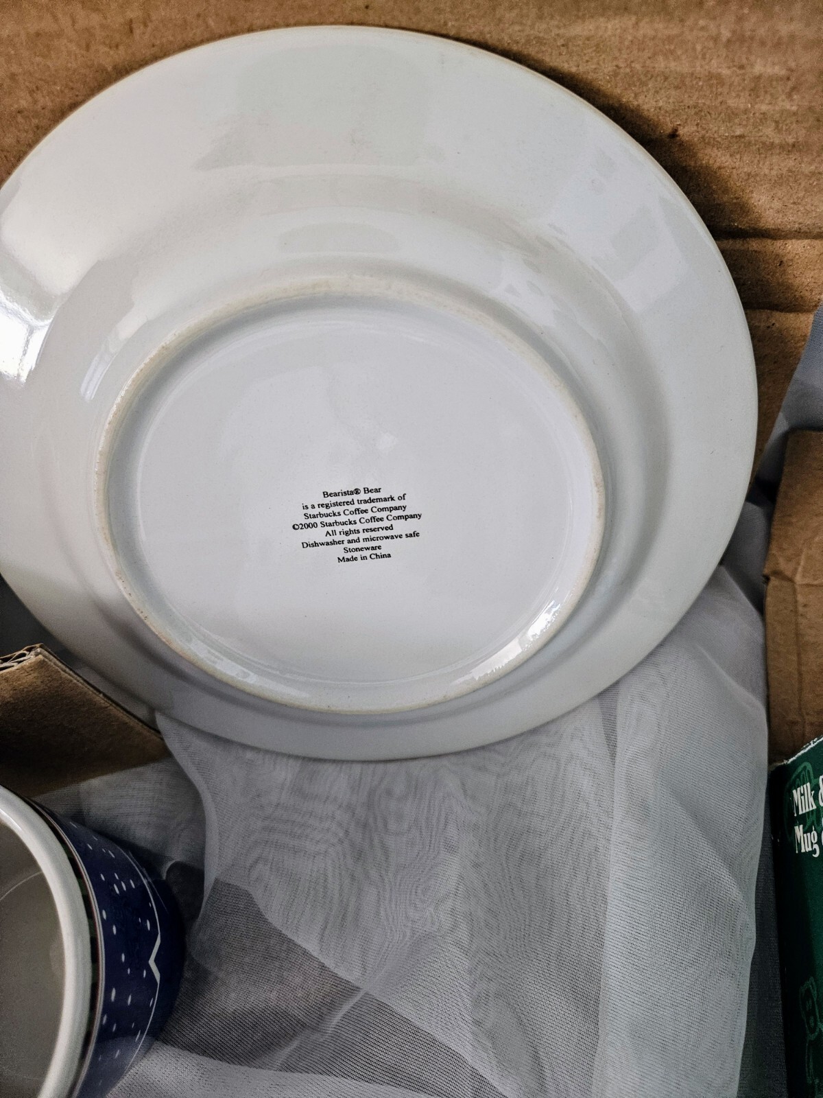 The Starbucks Barista XMAS Plate & Cup Set is an original collectible featuring a multi-color design. The theme of the set is centered around coffee and tea, making it a perfect addition for Starbucks enthusiasts. Made in China, this set includes a plate and cup with holiday-themed decorations perfect for festive occasions. *Box has some ware, but contents are new.