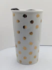 Starbucks Ceramic 2014 Gold Polka Dot Collection Travel Mug Tumbler w Lid 10 oz. Very nice pre-owned condition with no damage. I think the original lid was white and since this one is black, I believe it may be a replacement but this is the way it was purchased and it fits perfectly. This mug is double walled to keep your beverage hot longer. All of my items are carefully packed for shipping, no matter their value - $5 items are wrapped with the same care as a $200 item. My goal is to have your purchase arrive safely. I use recycled packaging when possible but mostly use new, high quality products so your item will arrive intact without damage. Large, heavy and fragile items are harder to use combined shipping with but just ask if you would like to purchase more than one item and I am more than happy to do so if feasible. If not, maybe we can work out a shipping discount. Thank you and hopefully you will visit my store again!