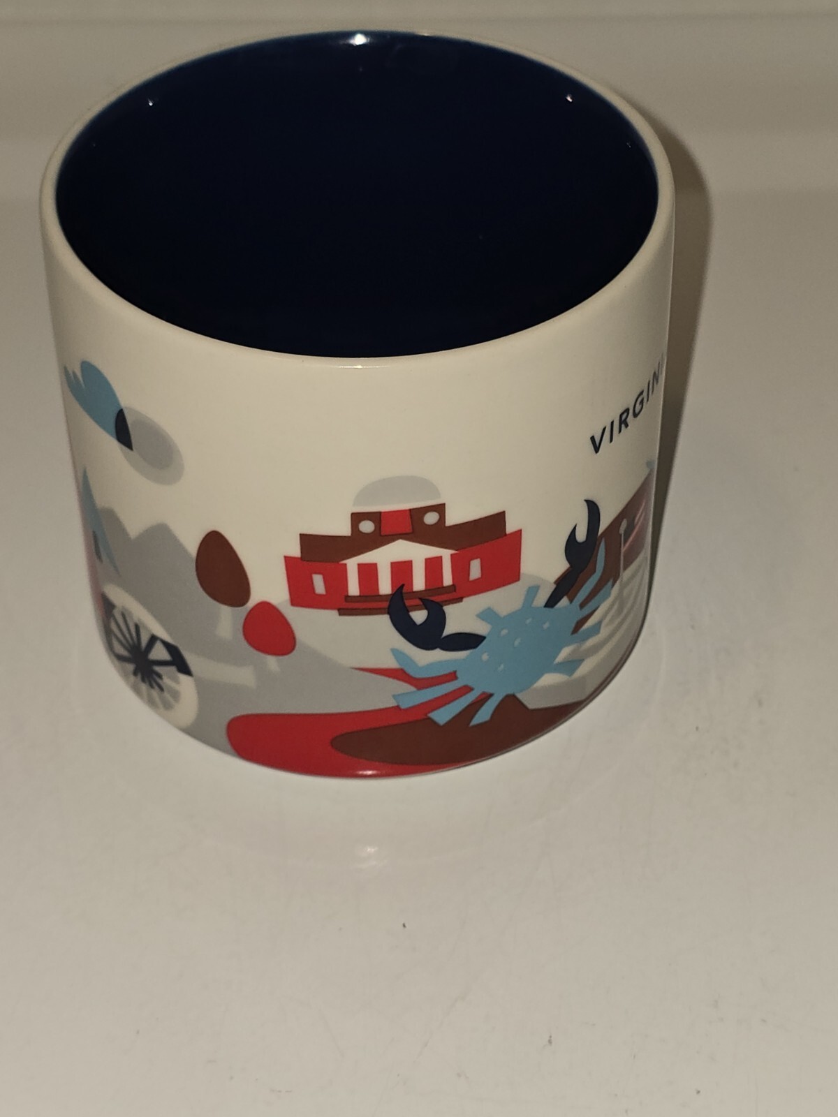 The Starbucks You Are Here Collection Virginia 14oz Collectible Coffee Mug Cup 2015 is a multi-colored original Starbucks mug with a capacity of 14 ounces. The mug features advertising for Virginia and was created in 2015. It is a collectible item and is manufactured in China.