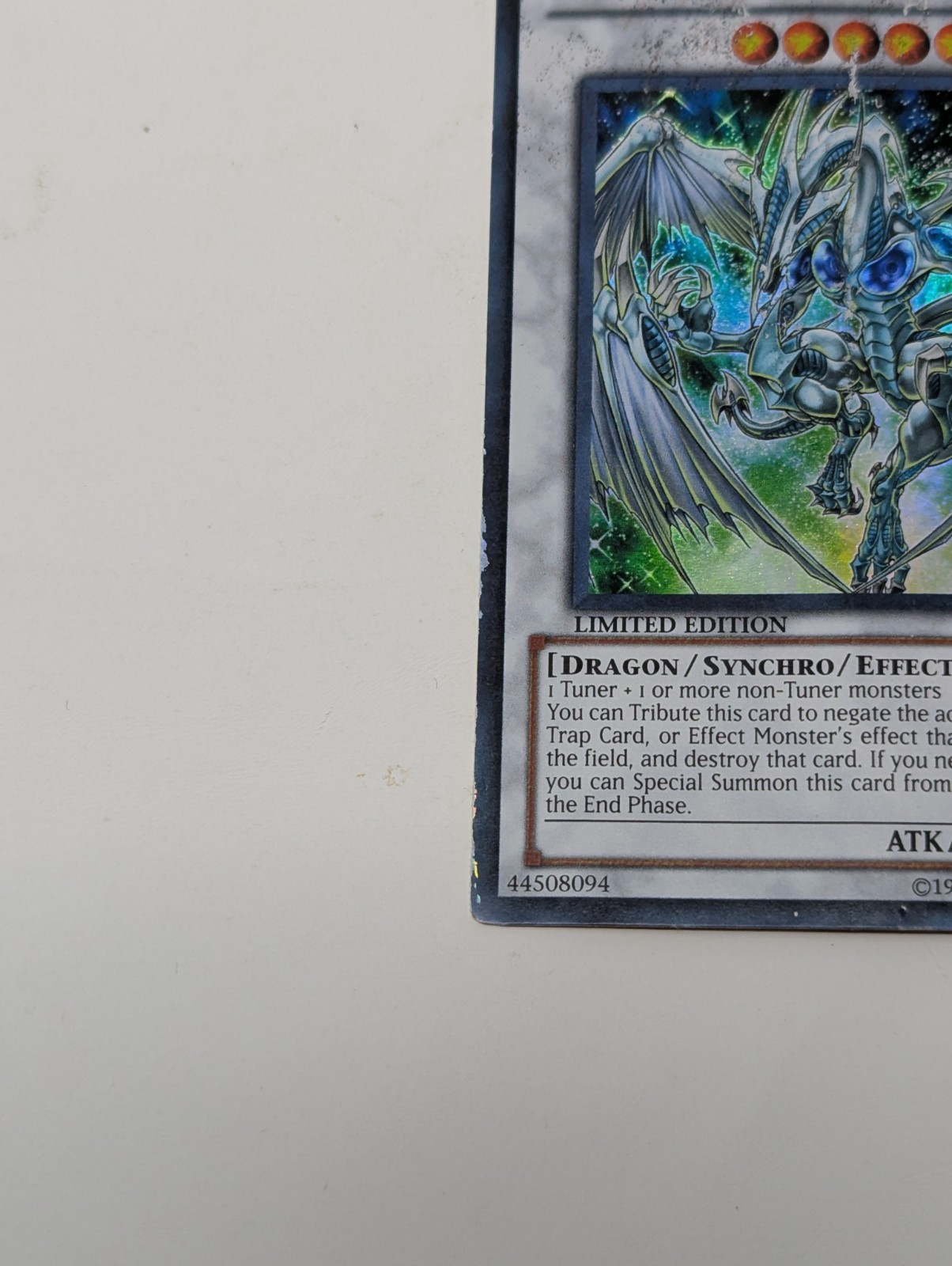 Up for sale is a limited edition Stardust Dragon card from the Yu-Gi-Oh! TCG. This Super Rare Synchro monster has an attack power of 2500 and is from the CT07 set. The card is made of high-quality card stock and features a holographic finish. This particular Stardust Dragon card is damaged, but still a great addition to any collector's or player's deck. It is the perfect card for those who love to collect vintage and rare items. Don't miss out on the chance to own this one-of-a-kind card!