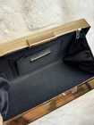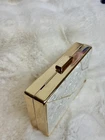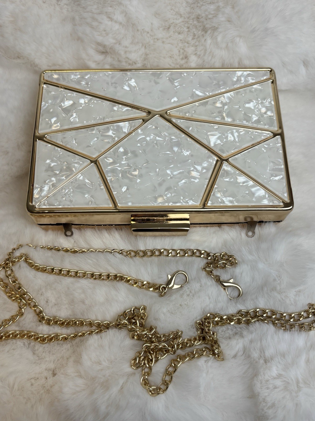 Featuring a geometric gold-tone frame and a pearlescent white marbled finish, this bag adds the perfect touch of glamour to any outfit. Can be carried as a clutch or worn with the included chain strap for hands-free elegance. * Brand: Starlet * Condition: Pre-owned (good overall condition, but with very minor superficial scratches) Please also note that some of the geometric are not 100% aligned and there might be some slight glue residue, however is this is very minimal * Color: White with gold-tone detailing * Material: Hard shell with marbled acrylic finish * Features: * Detachable gold chain strap * Geometric design with glossy pearl-like texture * Snap closure at top * Occasion: Perfect for weddings, parties, formal events, or a night out