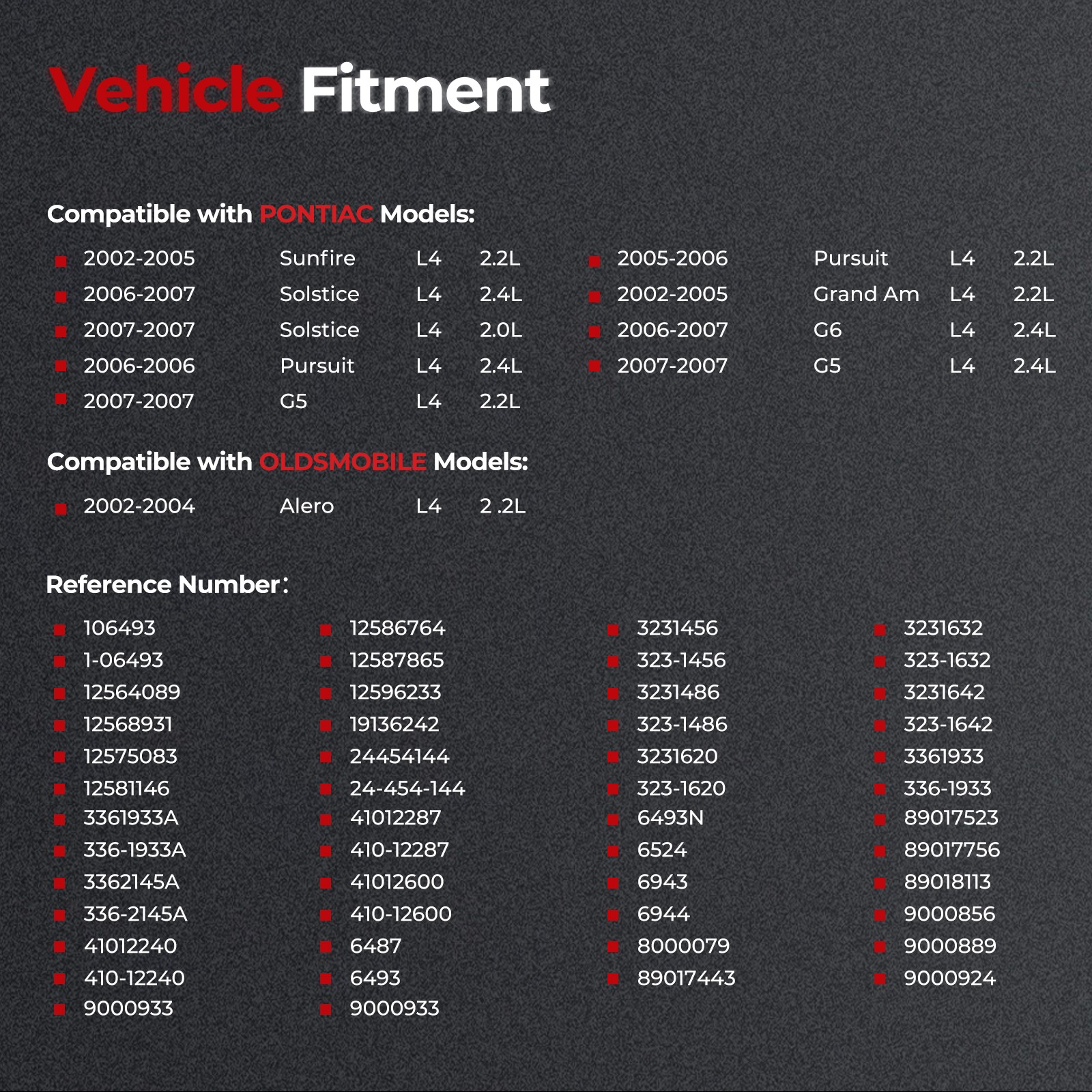 AC DELCO: 323-1456, 323-1486, 323-1620, 323-1632, 336-1933 ARROWHEAD: SDR0277 CARGO: 112899 DELCO: 10465551, 19136242, 89017443, 89017523, 89017756, 9000856, 9000933, 9000959, 9000976, 9000977 GENERAL MOTORS: 12564089, 12575083, 12581146, 12586764, 12587865, 89017523 J & N: 410-12240 LESTER: 6493 REMY REMAN: SR110639, SR110761 TELEDYNE: TM27M00520 WAI: 2-2144-DR, 6493N Advantages of Hanfeier Starter: Brand New Premium Components Meet or Exceed OE Specifications Top-tier Performance and Reliability Premium Rust-Prevention Treatment 6493 Starter Specification: Power Rating: 1.2KW Number of Teeth: 9 Voltage: 12V; Rotation: CW(Clockwise); Model:PMGR Home Payment Shipping Return Policy About Us Contact Us Feedback Parts & Accessories Other Alternator Starter Motor May you Like Starter for Kia Sportage V6 2.7L 2005 2006 2007 2008 2009 17764 36100-37210 43.99 USD 6485 Starter For 1999-2004 Chevrolet Silverado Pickup GMC Sierra 1500 4.3L V6 46.99 USD For Chevrolet Malibu 2013-2015 2.5L/2016-2019 2.0L 11682 Alternator 104210-1962 124.99 USD Alternator 13871 For Chrysler Town & Country Dodge Grand Caravan 2001-2007 73.99 USD 17939 Starter for Jeep Commander Grand Cherokee 3.7L M0T31471 56044734AA 28.69 USD 11191 Alternator for 06-11 Hyundai Azera 07-09 Santa Fe Kia Sorento 06-10 Sonata 79.99 USD Alternator For Dodge Journey & Grand Caravan 3.6L 2011 2012 2013 2014 2015 2016 79.99 USD Alternator 11011N For 2006 2007 2008 2009 Hyundai Accent Tucson Kia Rio Rio5 65.99 USD For Toyota Camry 2.2L 2164cc l4 Gas 1997-2001 Alternator 101211-9580 13754 65.99 USD Alternator 13649 12V For Honda Civic L4 1.6L 1996-2000 Del Sol 1.6L 1996-1997 69.99 USD Starter For Chevy Silverado Suburban & GMC Sierra Yukon 1500 2001-2002 4.8L 5.3L 46.99 USD Starter For Ford Explorer 97-10 Mustang 05-10 Ranger 98-11 4.0L Auto Trans 3273 45.49 USD Starter 6493 For Chevrolet Malibu Cobalt HHR 2.0L 2.2L 2.4L 2004 2005 2006 2007 Part Number: Part numbers listed below indicate interchangeable parts. These parts share the same size, parameter, function and compatibility. However, please note that items from different brands may have minor variations. AC DELCO: 323-1456, 323-1486, 323-1620, 323-1632, 336-1933 ARROWHEAD: SDR0277 CARGO: 112899 DELCO: 10465551, 19136242, 89017443, 89017523, 89017756, 9000856, 9000933, 9000959, 9000976, 9000977 GENERAL MOTORS: 12564089, 12575083, 12581146, 12586764, 12587865, 89017523 J & N: 410-12240 LESTER: 6493 REMY REMAN: SR110639, SR110761 TELEDYNE: TM27M00520 WAI: 2-2144-DR, 6493N Advantages of Hanfeier Starter: Brand New Premium Components Meet or Exceed OE Specifications Top-tier Performance and Reliability Premium Rust-Prevention Treatment 6493 Starter Specification: Power Rating: 1.2KW Number of Teeth: 9 Voltage: 12V; Rotation: CW(Clockwise); Model:PMGR Compatibility: Make Model Year Engine Size Note Chevrolet Cavalier 2002-2005 L4 2.2L 1.2KW, 12V, CW, 9T Classic 2004-2005 L4 2.2L 1.2KW, 12V, CW, 9T Cobalt 2005-2007 L4 2.0L 1.2KW, 12V, CW, 9T Cobalt 2005-2007 L4 2.2L 1.2KW, 12V, CW, 9T Cobalt 2006-2007 L4 2.4L 1.2KW, 12V, CW, 9T HHR 2006-2007 L4 2.4L 1.2KW, 12V, CW, 9T HHR 2006-2007 L4 2.2L 1.2KW, 12V, CW, 9T Malibu 2004-2007 L4 2.2L 1.2KW, 12V, CW, 9T Oldsmobile Alero 2002-2004 L4 2.2L 1.2KW, 12V, CW, 9T Pontiac G5 2007 L4 2.2L 1.2KW, 12V, CW, 9T G5 2007 L4 2.4L 1.2KW, 12V, CW, 9T G6 2006-2007 L4 2.4L 1.2KW, 12V, CW, 9T Grand Am 2002-2005 L4 2.2L 1.2KW, 12V, CW, 9T Pursuit 2005-2006 L4 2.2L 1.2KW, 12V, CW, 9T Pursuit 2006 L4 2.4L 1.2KW, 12V, CW, 9T Solstice 2006-2007 L4 2.4L 1.2KW, 12V, CW, 9T Solstice 2007 L4 2.0L 1.2KW, 12V, CW, 9T Sunfire 2002-2005 L4 2.2L 1.2KW, 12V, CW, 9T Saturn Ion 2003-2007 L4 2.2L 1.2KW, 12V, CW, 9T Ion 2004-2007 L4 2.0L 1.2KW, 12V, CW, 9T Ion 2006-2007 L4 2.4L 1.2KW, 12V, CW, 9T L100 2001-2002 L4 2.2L 1.2KW, 12V, CW, 9T L200 2001-2003 L4 2.2L 1.2KW, 12V, CW, 9T L300 2004 L4 2.2L 1.2KW, 12V, CW, 9T LW200 2001-2003 L4 2.2L 1.2KW, 12V, CW, 9T Sky 2007 L4 2.0L 1.2KW, 12V, CW, 9T Sky 2007 L4 2.4L 1.2KW, 12V, CW, 9T Vue 2002-2007 L4 2.2L 1.2KW, 12V, CW, 9T Vue 2007 L4 2.4L 1.2KW, 12V, CW, 9T Note: This list is a sample of all the compatible cars for this part. Make sure this product fits your car by using the part finder above. Note: Before purchasing a new starter motor, please verify the part number, OEM car starter pictures, specifications, vehicle make, model, and engine type to ensure this is the correct automotive replacement starter starters for your car. RL801839AB Starter Motor Feature: 1. Reliability: The car starter motor is designed and manufactured to provide high reliability, ensuring consistent engine starting in various conditions. 2. Efficiency: The starter motor efficiently converts electrical energy into mechanical energy, delivering sufficient torque and speed for quick engine startup. 3. Durability: Built with durable materials and precision engineering, the starter motor exhibits long-lasting performance, capable of withstanding frequent start cycles and harsh environmental conditions. 4. Quick Start: Equipped with quick-start capabilities, the starter motor rapidly responds and initiates engine ignition, reducing wait times and unnecessary delays. 5. Precise Control: Advanced control systems in the starter motor enable precise current regulation and smooth startup processes, ensuring reliable and controlled engine ignition. When to replace car starter motor: 1. Difficulty Starting: Difficulty starting the car, requiring multiple attempts before it successfully starts. 2. Unusual Noises: Hear grinding sounds, harsh metallic friction noises, or any other unusual sounds when starting the car. 3. Power Issues: When turning the key or pressing the start button, if the engine fails to start or only produces clicking sounds without the normal cranking noise. 【Important Tips】Hanfeier starter motors are brand-new and undergo 1OO% testing. Q1: The car has a new starter but won't start and makes a clicking sound. A1: In this situation, we must consider wheth