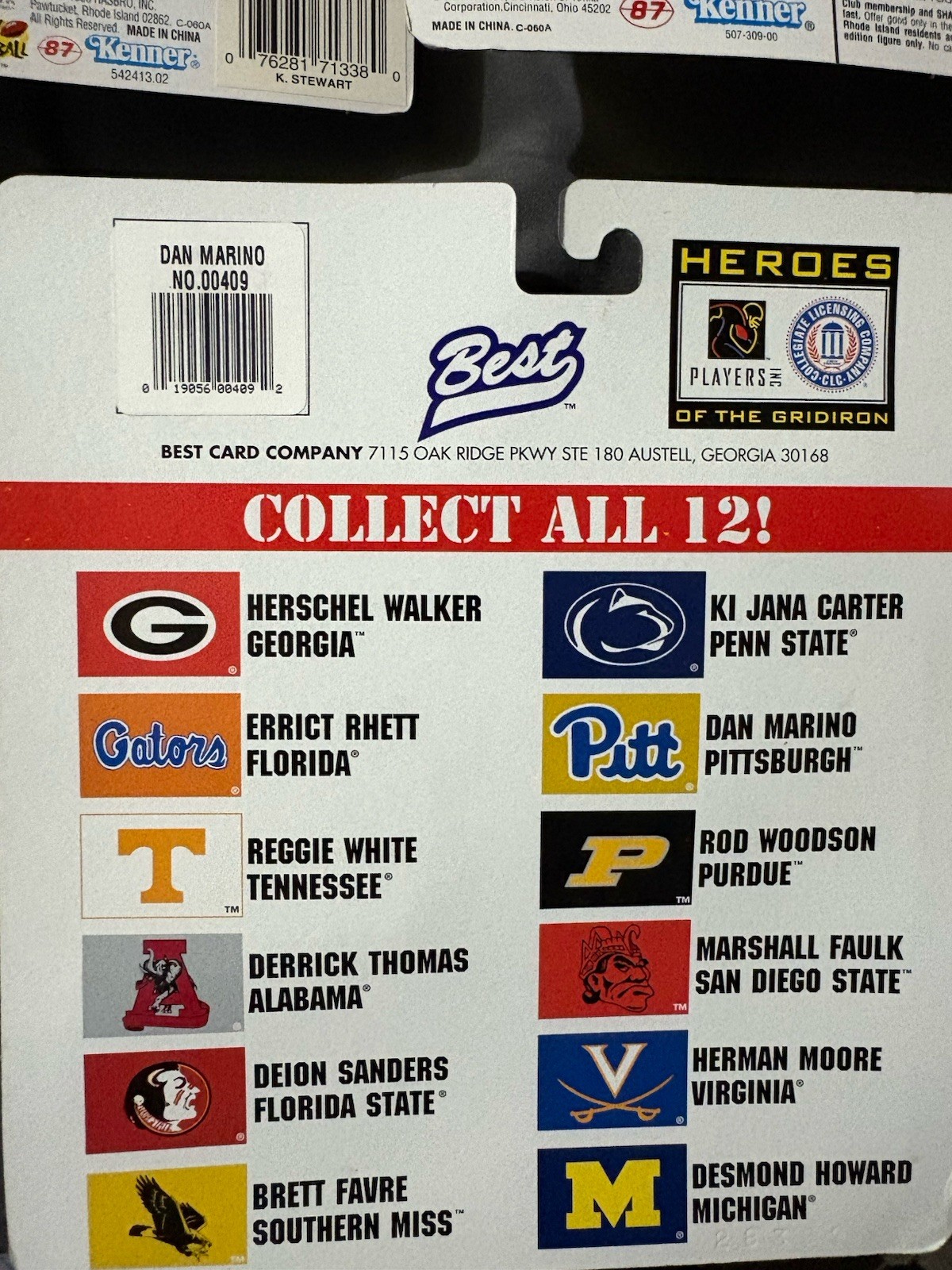 9 total 1993 Starting Lineup Pirates Honus Wagner 1993 Starting Lineup Pirates Barry Bonds 1993 Starting Lineup Steelers Barry Foster 1996 Starting Lineup Penguins Ron Francis 1996 Starting Lineup Penguins Tom Barrasso 1997 Starting Lineup Heisman Pitt Tony Dorsett 1997 Starting Lineup Steelers Kordell Stewart 1998 Starting Lineup Penguins Mario Lemieux Other figure is a 1997 Best brand Dan Marino Pitt action figure