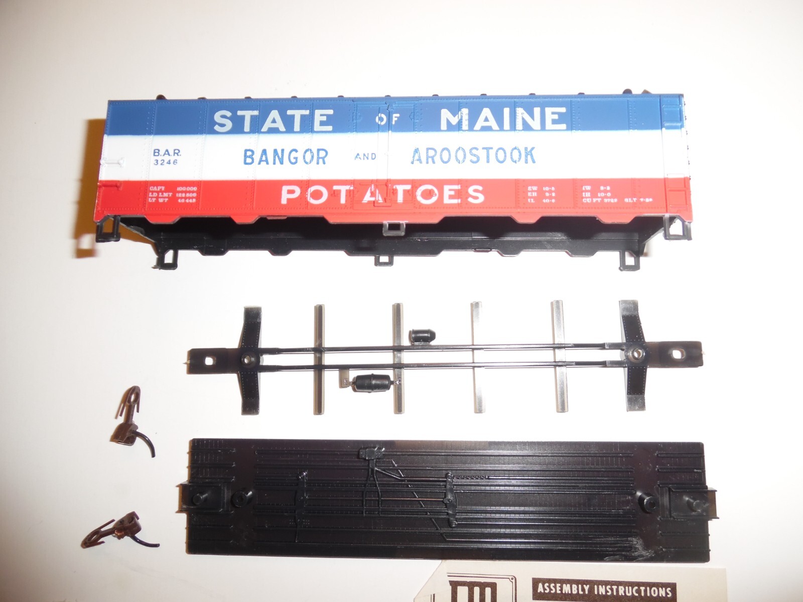 Train Miniature HO Scale model train HO SCALE MODEL TRAIN FREIGHT CAR KIT 40 foot REFRIGERATOR CAR KIT - EASY TO ASSEMBLE ROAD NAME: BANGOR AND AROOSTOOK "STATE OF MAINE" ROAD NUMBER: B.A.R.3246 NEVER BUILT UP - Easy to Assemble kit In addition to the factory supplied horn hook couplers, I included are a pair of BACHMANN EZ MATE magnetic knuckle couplers! You decide which type to install. SEE ALL PHOTOS FOR DETAILS OF WHAT YOU WILL RECEIVE NEW in the original box. PHOTOS ARE PART OF ITEM DESCRIPTION: Please do not assume anything. What you see in the photos with regard to this item is what you will receive. Please contact me prior to purchasing if any lingering questions, concerns, or need for additional information. Please view the photos for details as to design and condition. Check pictures with Ebay Zoom/Enlargement enhancement function so that you can clearly see what you will receive. Buyer will receive the item(s) shown in the photos. COLOR VARIANCE : Color tone can be affected by your screen monitor. Hue and depth of color is also affected by lighting sources such as sunlight, room lighting and digital camera flash. Photos are taken with and without digital flash. Color hue and tone will always be affected by light source.