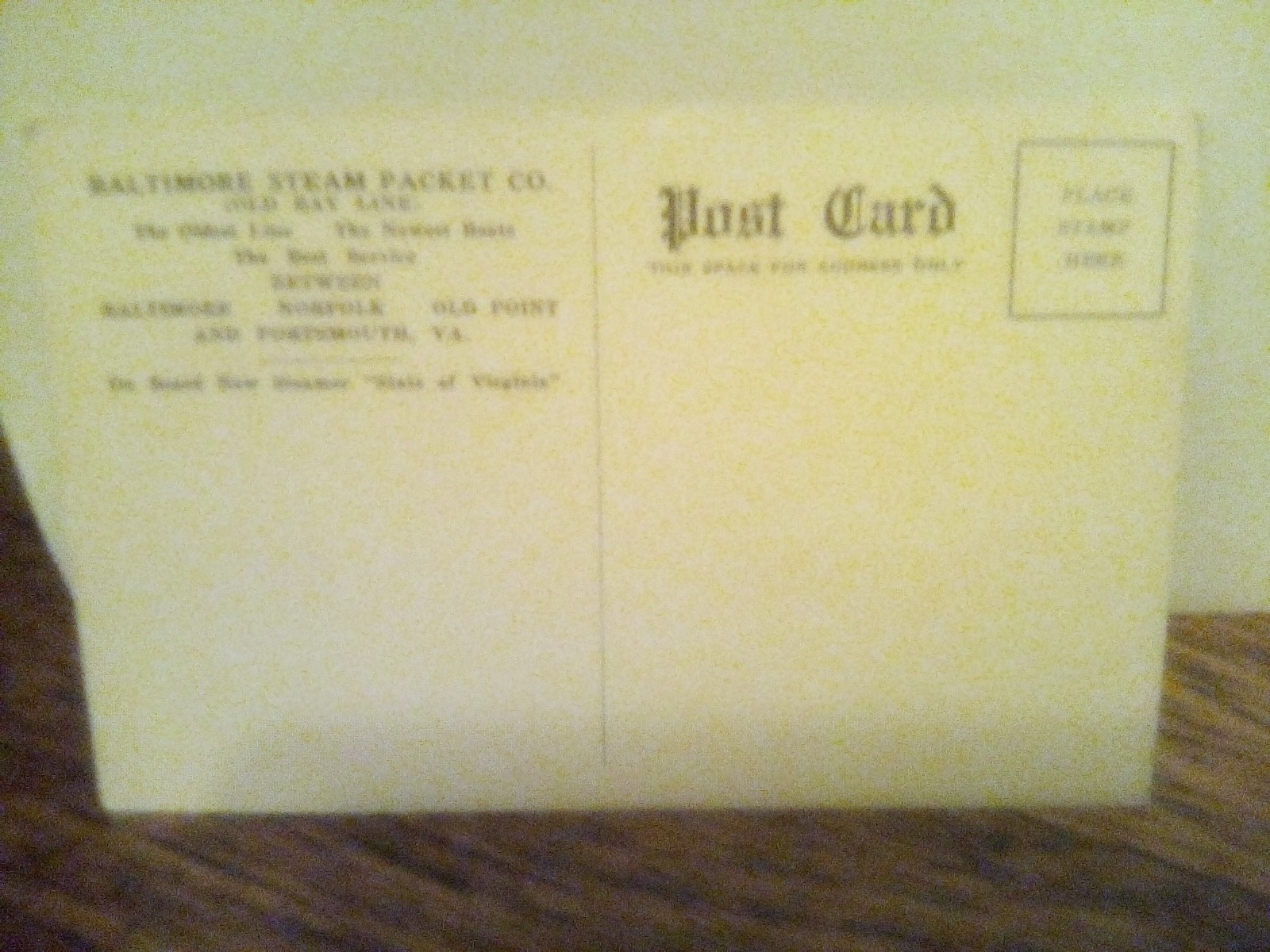 The product is a vintage postcard featuring the State of Virginia Steamer Old Bay Line operated by the Baltimore Steam Packet. The postcard captures the historic boats and ships, reflecting the era of the early 20th century. Made of paper, this original postcard from North America showcases the unique charm of Virginia and its cities, making it a one-of-a-kind collectible for postcard enthusiasts.