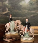 Stunning Rare Antique English Staffordshire Equestrian Mantle Flatback Pair Depicting Elegant Noble Prince and Princess on Horseback β’ Rare Gallery Quality Equestrian Figures β’ Height 7.5β I am delighted to offer this lovely pair of timeless equestrian themed mantle flatbacks featuring elegant right and left facing horses carrying prince and princess (Victoria and Albert) dressed in beautiful riding clothes in classic form from Staffordshire, England. This marvelous statement pair of noble equestrian figures will make elegant showpieces when placed on their own or as a stunning addition to a collection or arrangement. Excellent condition. Marvelous surviving period examples to own and treasure. Turn of century marks to bases. Happy Bidding!! Height 7.5β