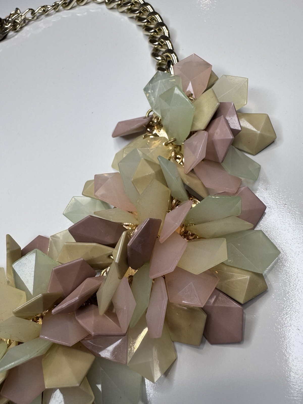 Beautiful statement necklace featuring large pastel acrylic stones in soft shades of pink, mint, cream, and lavender. The stones are faceted and clustered together on a gold-tone chain, creating a bold and elegant look. Perfect for parties, weddings, or adding a pop of color to any outfit. Condition: Gently used, in good condition. Material: Acrylic stones, gold-tone metal Length: Approx. 18 inches (adjustable chain) Style: Bib / Collar / Statement Necklace Color: Multicolor – Pastel tones
