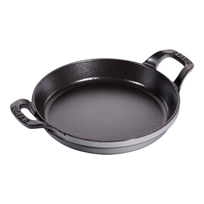 Staub Cast Iron 7.5-inch, Round, Gratin Baking Dish, Graphite Grey For centuries, cooks have taken advantage of the natural heat retention and redistribution properties of cast iron. Staub builds on this tradition with our enameled cast iron cookware. Black matte enamel inside and cooking surface creates a culinary advantage for better browning, braising, and roasting. Colorful enamel outside adds flare to your kitchen and table. Safe for use on all types of heat sources, including gas, electric, and induction, and oven safe up to 500°F. Chip resistant and dishwasher safe. Made in France. Made in France Oven Safe up to 500°F Smooth enamel bottom works on all stovetops Each piece is one of a kind Rough texture results in exceptional browning Requires no seasoning Dishwasher safe.