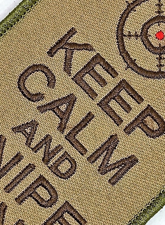 KEEP CALM AND SNIPE ON 2.5" x 4" MULTICAM TACTICAL EMBROIDED MORALE PATCH 2A SECOND AMMENDMENT GUN RIGHTS RIGHT TO BEAR ARMS Tactical patch fully embroidered for backpacks, clothes, caps, bags and military uniforms. Hook backing 3D patch Raised trim is green, raised lettering is brown. raised image of a target is brown and red bull's eye