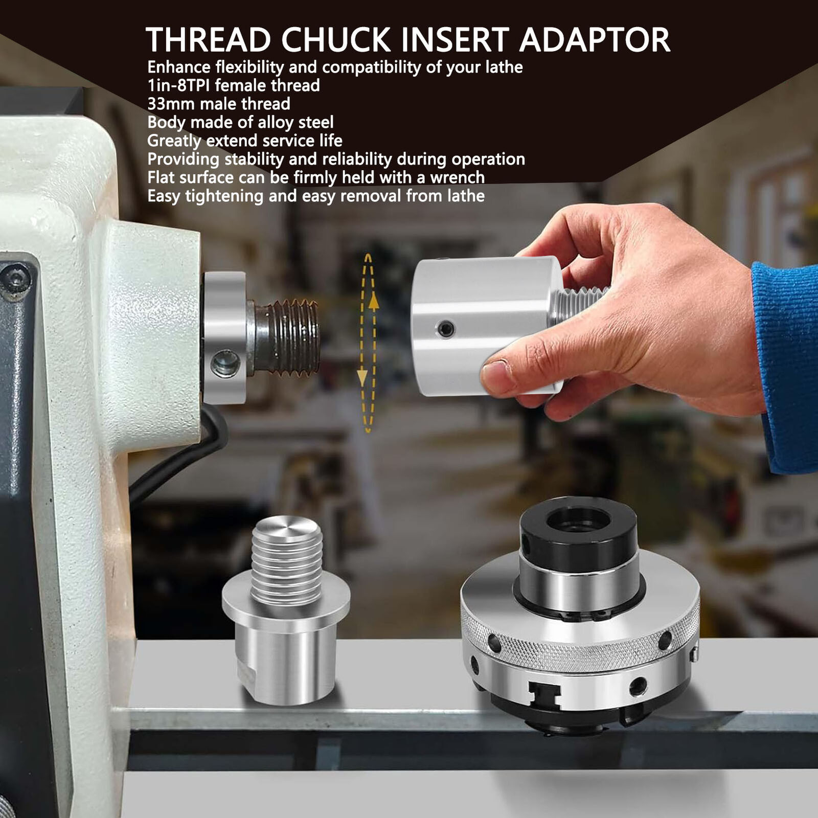 Feature: 1. THREAD SPECIFICATIONS: Enhance the flexibility and compatibility of your lathe with a premium spindle adapter. Male thread 1in‑8TPI, female thread 33mm 2. STRONG MATERIAL: Lathe headstock spindle adapter body is made of excellent alloy steel material, long lasting and greatly extend the service life of lathe 3. EASY DISASSEMBLY: Providing stability and reliability during , the headstock spindle adapter has a flat that can be firmly held with a wrench for easy tightening and easy removal from the lathe 4. ESSENTIAL ACCESSORY: This woodworking lathe chuck wire changer is an important connection point for a variety of accessories, including chucks, panels and other related tools, enabling you to work efficiently on the lathe 5. CONVENIENT AND VERSATILE: Experience the convenience and versatility that spindle adapters bring to your woodworking projects, useful and practical, you can use with confidence Specification: Item Type: Woodworking Lathe Headstock Spindle Adapter Material: Alloy steel Male Thread: 1in-8TPI Female Thread: 33mm Height: Approx. 76mm / 2.99in Diameter: Approx. 50mm / 1.97in Package List: 1 x Woodworking Lathe Headstock Spindle Adapter