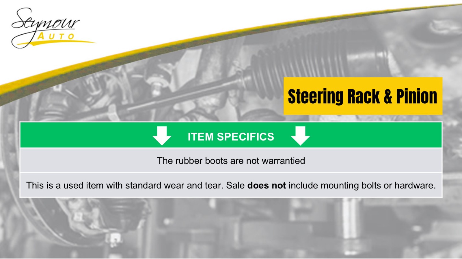 Hollander Welcome to our eBay store! Steering Gear/Rack Power Rack And Pinion Electric Fits 11-16 OPTIMA 1417860 Description Donor Vehicle Model : OPTIMAKIA Year : 2013 Mileage : 119000 (0 = not available or unknown) Stock Number : 250648 Notes : This Part Will Fit These Makes And Models With These Options OPTIMA 11 Power Rack and Pinion; Hybrid, from 4/19/2011 OPTIMA 12 Power Rack and Pinion; Hybrid OPTIMA 13-15 Power Rack and Pinion; 2.4L, VIN D (8th digit, hybrid) OPTIMA 16 Power Rack and Pinion; (electric), column mounted motor, 2.4L, VIN D (8th digit, hybrid) SONATA 11 Power Rack and Pinion; 2.4L, VIN 4 (8th digit, hybrid), from 4/15/2011 SONATA 12-15 Power Rack and Pinion; 2.4L, VIN 4 (8th digit, hybrid) About Us Payment Shipping Returns Warranty About Us We are a locally owned business with over 70 years of experience in the automotive industry with an extensive collection of used car parts and accessories for thousands of different vehicles. Our knowledgeable and caring staff work hard every day making sure all of our parts are high quality and functional to fit your needs. We are happy to verify fitment for you prior to purchase via your vehicle’s VIN (Vehicle Identification Number). Please contact us with any questions prior to purchasing. Orders are sent to the shipping department throughout the day therefore we cannot guarantee adjustments to orders after payment is received. Payment Payment details: Please contact us with any questions prior to purchasing. Orders are sent to the shipping department throughout the day therefore we cannot guarantee adjustments to orders after payment is received. All orders must be paid in full prior to shipment. Payments are processed through eBay by eBay. If payment is not received within a reasonable time from when the order is placed, it will be cancelled without notice. All purchase prices are final. No price match or discount can be made while an item is awaiting payment. Shipping Shipping Details: FREIGHTED ITEMS MUST BE SHIPPED TO A COMMERCIAL ADDRESS WITH A LOADING DOCK AND A FORKLIFT, ABLE TO REMOVE THE PALLET FROM THE TRUCK. WE ALSO COULD FREIGHT TO A LOCAL FREIGHT TERMINAL. PLEASE CONTACT US FOR RATES ON FREIGHTED ITEMS. Items are shipped after being paid in full. We only ship to US addresses within the continental 48 states. Shipping to AK, HI and PO Box's require a special rate and are subject to additonal charges. All parts listed with Free Shipping have a one day handling time and may not be picked up by the carrier the same day the part is ordered. Any estimated delivery dates provided are only estimates and are not guaranteed to be accurate. We are not responsible for any delays with UPS, Fed-Ex or USPS. We must be contacted same day if an item is received damaged. All address changes must be completed before the part is shipped. Address changes that take place after the part has been shipped are subject to an address change fee. Overnight and expedited shipping options are available for an additional cost. All parts listed as, Pick Up Only , can be shipped if the shipping cost is covered by the buyer. All parts listed as, Pick Up Only , will be held at Seymour Auto Wrecking (107 New Haven Rd, Seymour CT 06483) for the buyer. International orders are shipped via eBay’s Global Shipping Program. We are not responsible for any shipping charge associated with eBay's Global Shipping Program. We are unable to change the delivery address on all orders shipped through eBay's Global Shipping Program. eBay must be contacted directly. We are not responsible for any delays or issues reagrding any item purchased and shipped through eBay's Global Shipping Program. Returns All parts sold have a standard 30-Day return window. Return Details: We must be contacted within 30 days of the carrier provided delivery date for the return to be accepted. No return wil be accepted if contacted after 30 days from the carrier provided delivery date. We may require more information reagrding a return request. ex: pictures, receipts, videos, etc. A free return label will not be provided for remorse return reasons. ex: changed mind, ordered by mistake/by accident, didn't like it The buyer must ship the return within 21 days of receiving a return label or starting a return. All returns must be sent in the appropriote sized box with adequate packaging. Any return received damaged may be eligible for a refund deduction. All returns made must be occompanied with a return reason. All returns that are received without a reason will not be processed. If a return label is issued by eBay, we are not responsible for reimbursing the buyer for the cost of the label. In the event the part returned does not match the original part sent, a case will be opened up with eBay. Warranty All parts come with our standard 6-month warranty. Please contact us for more details prior to ordering. The warranty begins as soon as the buyer takes possession of the part. Standard 6-Month Warranty: If a part is proven to be defective within the 6 month warranty period, a replacement or refund will be sent at our discretion. We are not responsible or liable for any incidental or consequential loss or damage. We will require more information reagrding a warranty request. ex: pictures, receipts, videos, etc. No warranty claims or reimbursement on labor. All body parts are sold as is. Any part that is damaged or altered by the buyer will not be eligible for warranty or return. No warranty claim can be made based on color or trim package. We are not responsible for the buyer's error. ex: Accidental orders, late address changes. We do not offer an extended warranty with eBay. If you experience any issue with your part, please contact us prior to attempting to repair or remove the part. Failure to do so will void the warranty. We make no claim as to the suitability of any part for any particular purpose. The buyer is responsible for determining the suitability of the part purchased for its in