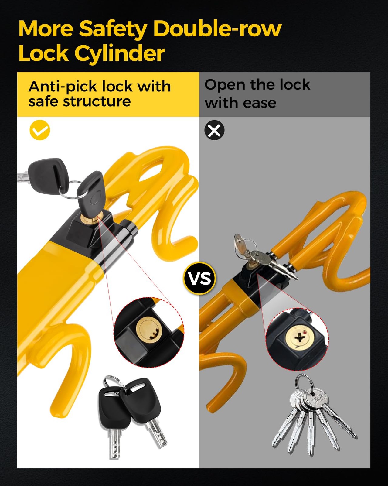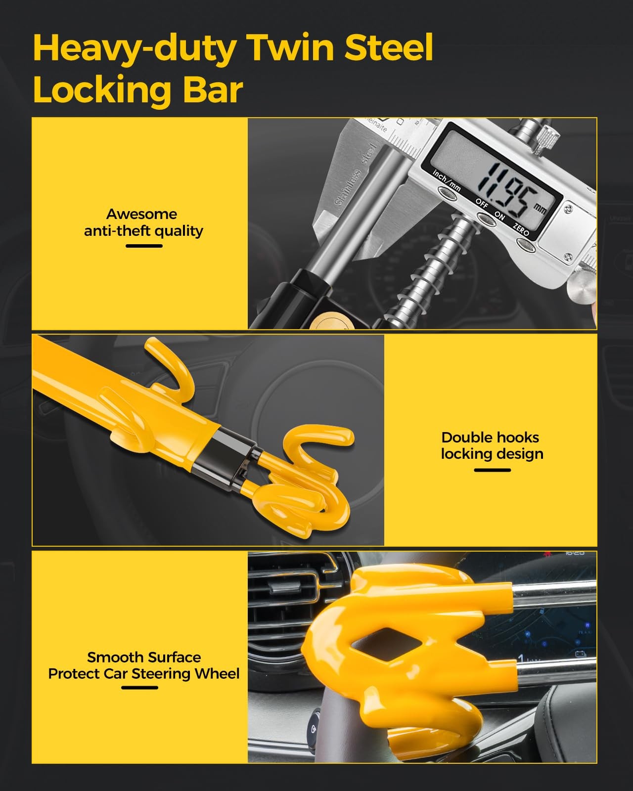 Double Design --- The steering wheel lock anti-theft device adopts the design of four locking hooks and twin bars, which can give you double assurance. The car antitheft device is easy to use, install and remove. A+ Grade Protection --- High quality steel and aluminum makes the car wheel lock stronger. The double spring crescent lock sub-type encoding key is specially designed to prevent professional thieves. More Safety --- The bright yellow is designed for maximum visibility day and night. The AntiTheft steering wheel lock is treated with a plastic dipping process that will not damage you steering wheel. For Most vehicles --- The universal anti theft steering wheel lock can be adjusted to fit steering wheels with inner diameter between 5.1"-12.5" for sedans, SUV, pickup trucks, vans, trucks etc. Support --- Our products have been entitled to and our brand offers an excellent after-sales service. If you need any assistance, please feel free to .