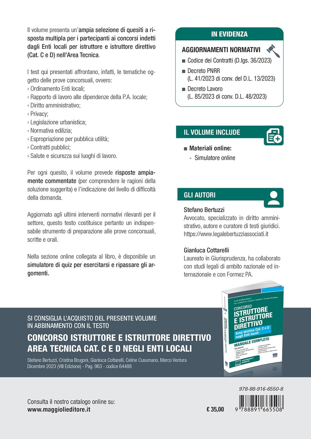 Further Details Title: Concorso Istruttore e Istruttore Direttivo - Area tecnica Cat. C e D negli Enti locali. QUIZ COMMENTATI Condition: New Format: Paperback Author: Stefano Bertuzzi, Gianluca Cottarelli EAN: 9788891665508 ISBN-10: 8891665509 ISBN: 9788891665508 Release Date: 06/28/2024 Edition: Edizione standard Item Weight: 710 gg Item Length: 27mm Item Height: 240mm Type: Industria e studi industriali Language: Italian Release Year: 2024 Missing Information? Please contact us if any details are missing and where possible we will add the information to our listing.