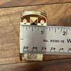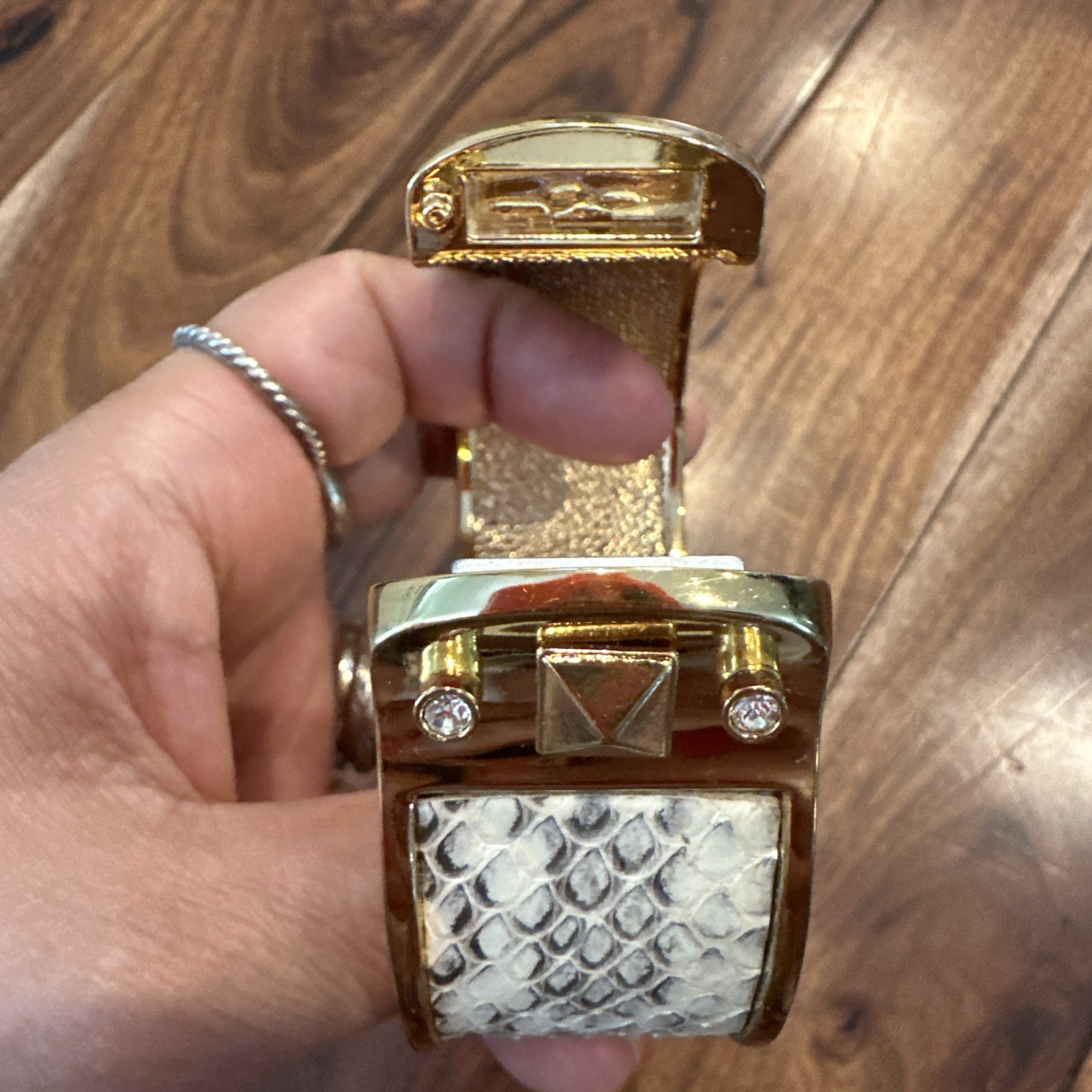 The Stella & Dot Bello Clamper Gold Tone Rhinestone Snakeskin Bangle Bracelet is a stylish and elegant accessory that features a unique oval clamper design with a magnetic closure. The bracelet is adorned with clear rhinestones and a gold tone metal finish, giving it a luxurious look. The snakeskin detailing adds a touch of sophistication, making it a perfect piece for special occasions like weddings, anniversaries, or Valentine's Day. The bracelet is signed by the brand and is sure to make a statement with its eye-catching design and high-quality materials.