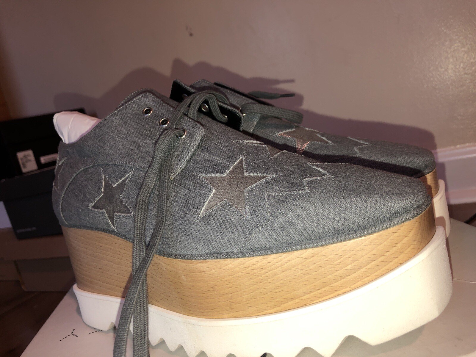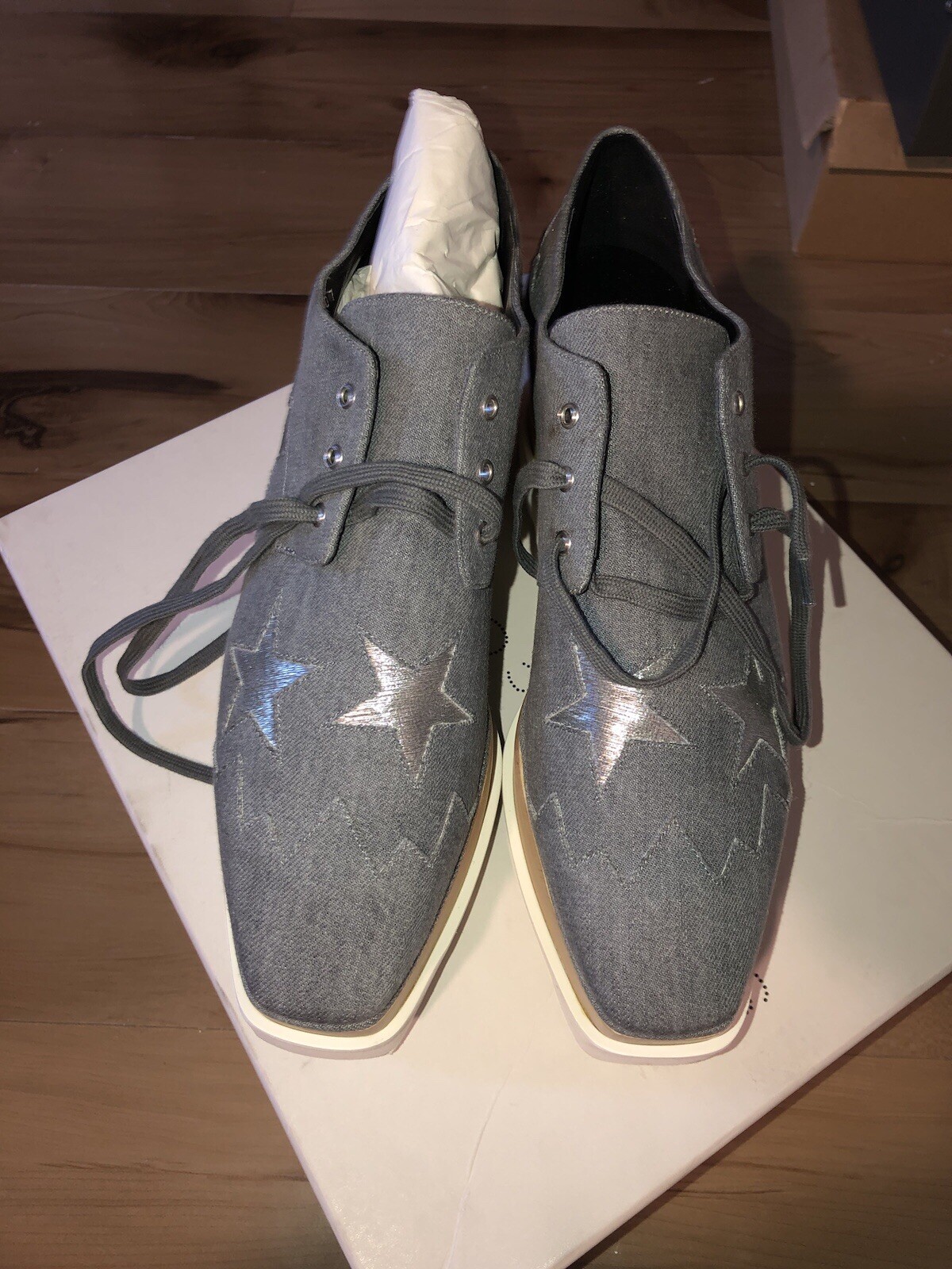 Elevate your style with these stunning size 41 Stella McCartney Light Blue Denim Fabric Elyse Stars Platform Lace Up sneakers. The almond toe shape and lace-up closure provide a comfortable fit, while the 3-inch platform height and high 3-3.9 inch heel height add a touch of glamour. The rubber outsole and standard shoe width ensure durability and comfort. These stylish sneakers are perfect for any occasion, from a casual day out to a night on the town. The stars theme adds a fun and unique touch to the design, making these shoes a must-have for any fashion-forward woman.