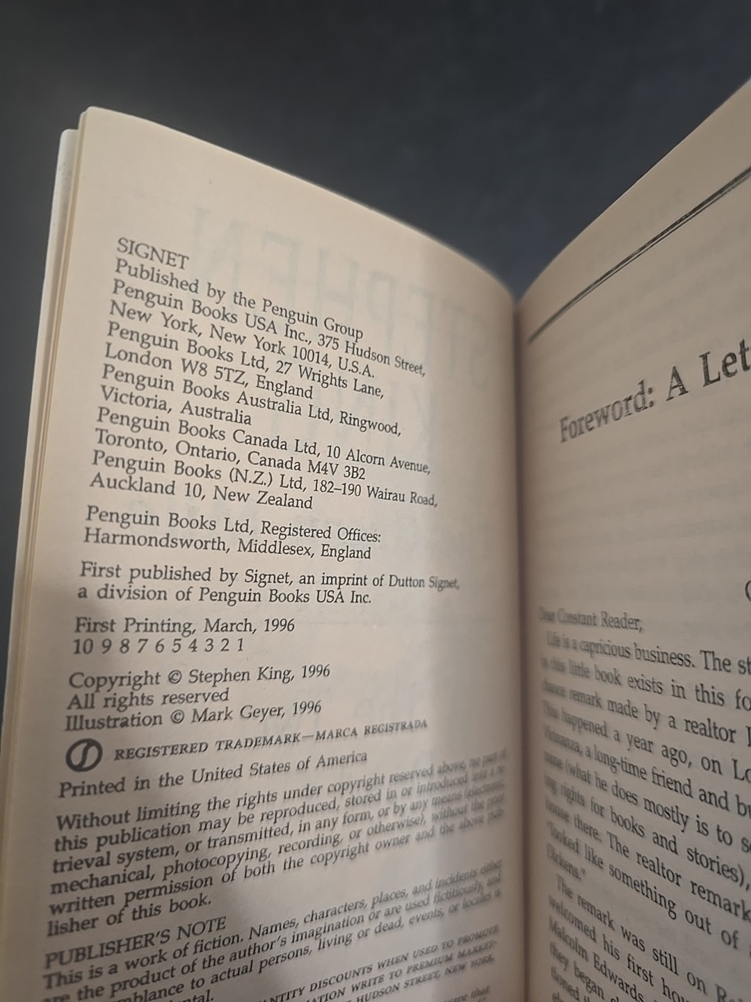 For sale is the complete 6-volume The Green Mile series by Stephen King, published by Signet in 1996. This is the original first printing set, each volume individually released in serialized format: 1. The Two Dead Girls 2. The Mouse on the Mile 3. Coffey’s Hands 4. The Bad Death of Eduard Delacroix 5. Night Journey 6. Coffey on the Mile All books are first printings from March 1996 (as shown in the interior photo). Covers and spines are in very good condition with light shelf wear and no major flaws. Pages are clean, bindings tight. A must-have for Stephen King collectors or fans of unique publishing formats! Details: Author: Stephen King Publisher: Signet / Penguin Books Format: Mass market paperback (6 separate volumes) Year: 1996 Condition: Very Good (see photos)
