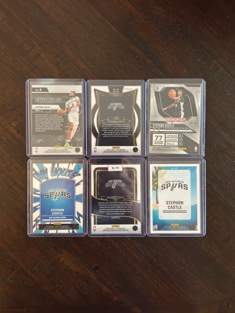 The Stephon Castle RC 6 Card Lot features a variety of inserts and parallels from popular basketball card sets like Panini Select, Donruss Optic, Mosaic, and Prizm Monopoly. This standard-sized card lot includes a total of 6 cards showcasing the talented player in his San Antonio Spurs uniform. Each card is made of durable card stock material and includes features like holograms, base set design, and rookie design. With original licensing from Panini, this collection is a must-have for basketball card collectors looking for unique and valuable additions to their collection.