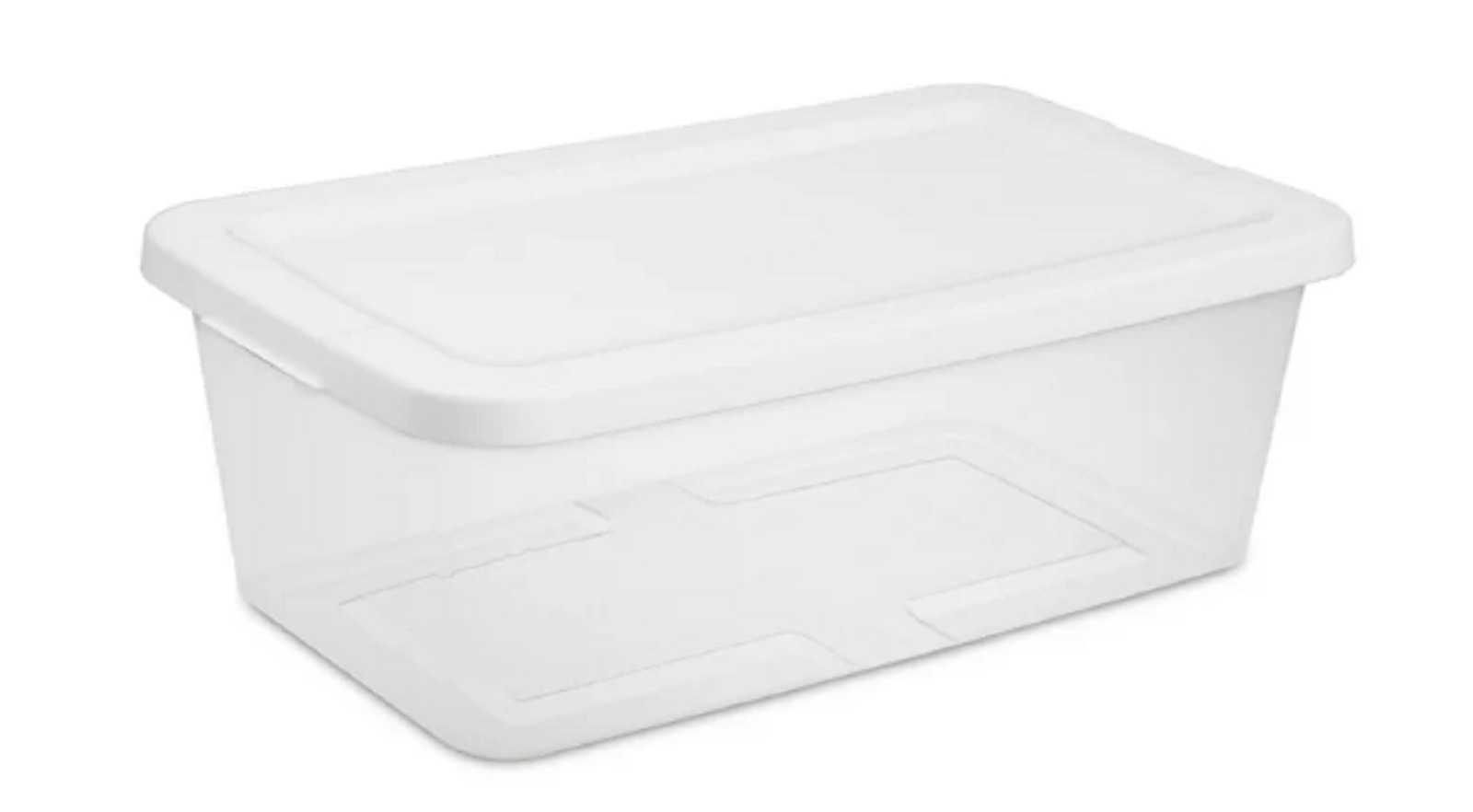 Sterilite Set of (10) Small Storage Bin, 6 Quart Clear Plastic Storage Container with Snap-On Lid, White Description : Organization is made easy with Sterilite's Set of (10) 6 Quart Storage Boxes! The convenient pack includes ten of the popular 6 Quart size storage bins with lids. The clear base lets you see what's inside while the snap on-lid keeps everything contained. The space-efficient shape and deep recessed lids allow bins to stack securely, maximizing vertical storage space. Sort and store a variety of household items to bring order to closets and bedrooms! This size plastic storage container is ideal for storing shoes, accessories, crafts and more, and conveniently fits on standard closet shelving. Note: Use good judgment when storing items, don’t overload, keep heaviest bin at bottom, and don’t stack too high. The overall assembled dimensions of this item are 13 1/2" L x 8" W x 4 5/8" H. Sterilite Set of (10) 6 Quart Storage Boxes, Clear Plastic Storage Bin with Snap-on Lid, White Outside Dimensions: 13 1/2" x 8" x 4 5/8" Interior Dimensions at bottom: 11 1/2" x 6" x 4 1/4" Clear base allows you to view contents at a glance Snap-on lids keep contents contained and are recessed to allow for stacking Ideal for basic storage needs throughout the home, and fits on standard closet shelving Use good judgment when stacking items, keep heaviest bin at the bottom BPA-free and phthalate-free