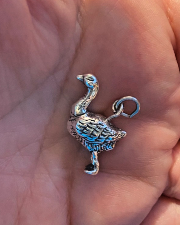 This one large 3D sterling silver charm is a Movable goose laying an egg. The egg moves slightly up and down. The photo shows one with the egg in and one with the egg out. It is 2.5 cm wide and 2 cm tall and .9 cm deep! It looks as good on the front as it does on the back. Look in my ebay store for 6000 other charms as well as chains and many other sterling silver jewelry items!