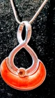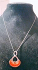 This is a beautiful sterling silver necklace with a 9.25mm cabochon coral pendant and a cluster setting of two gemstones. The necklace is 20 inches in length and has a lobster clasp closure. The pendant is asymmetrical in shape and the necklace is engraved with a charm. This necklace is perfect for a variety of occasions including engagements, weddings, anniversaries, birthdays, and Valentine's Day. The necklace is eye clean and has a very good cut grade. The necklace is made of fine silver and has a metal purity of 925.