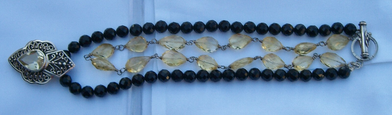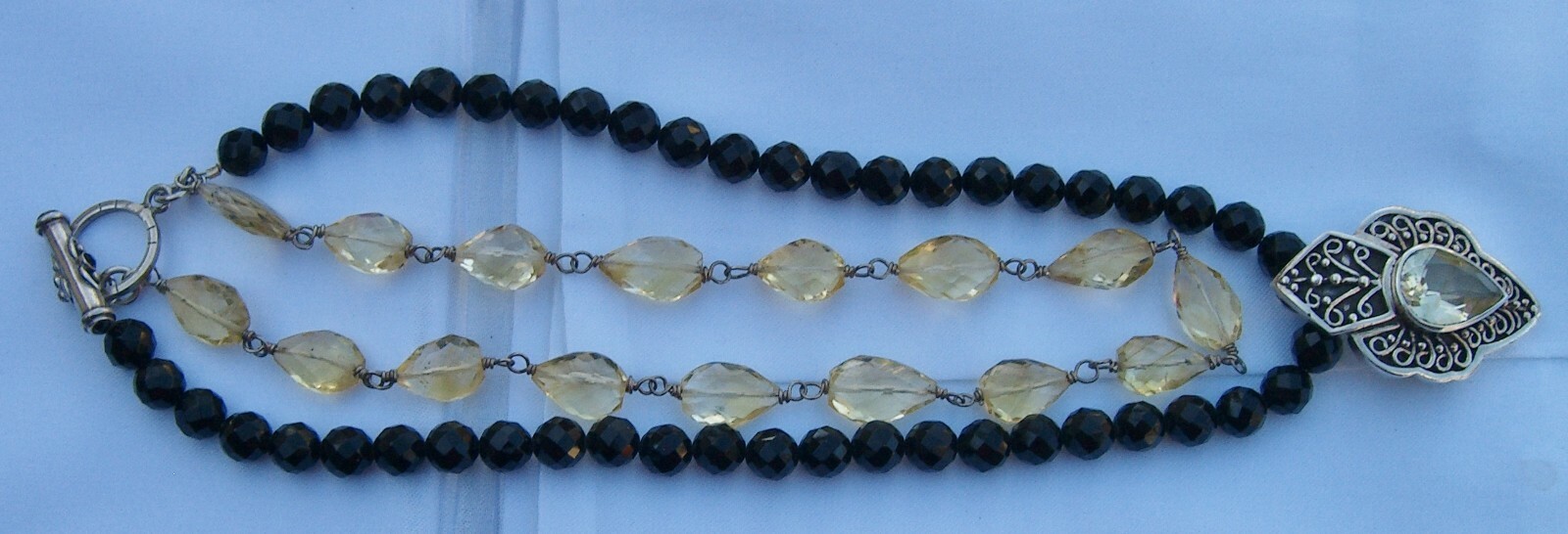 Sterling Silver and Citrine pendant hung on a double necklace. The pendant is attached to a beaded onyx string with a second strand of large citrine stones strung to hang inside the outer onyx strand. Sterling Silver clasp has insets of onyx. Beautifully designed. Pendant measures approximately 1 7/8" tall and 1 1/8" wide. Necklace circumference approximately 16". Marked 925 on pendant bail. No other markings found. Excellent Estate condition. Silver and stones show a less than normal surface wear. See other items JUST THE FACTS, MA'AM NOTES I try hard to have all silver hand polished before shipping. Most will have been polished before the photos were taken. Sometimes I miss. I do not polish any other metals. All books may have a penciled or erased price on the 1st end page. I do try to so note. But, again, sometimes I miss. SHIPPING DISCOUNTS Always happy to combine multiple purchases if physically and safely possible. SHIPPING --CONTINENTAL UNITED STATES eBay's shipping and fees policies have required the addition of a Shipping & Handling fee -- minimum $1.00. The S&H fees will include Tracking on all packages, subject to USPS rules. For all purchases $49.99 and over, all James Avery, and all breakables, the S&H fee will also include USPS or eBay Sponsored Insurance fees for the 'Estimated Closing Price'. Current Priority Mail rules give automatic, free insurance for some Priority Mail packages. If your package qualifies I will refund any S&H fees I charged for insurance. Because of "Estimated Closing Price" and the all too frequent 'wild hair' that is eBay -- eBay's shipping calculator and actual shipping and handling costs ofttimes vary. I send out invoices thru the eBay system ASAP (usually within 24 hours) and will correct shipping charges on those invoices. If you wish to avoid a potential slight overcharge, please, wait for my invoice. I cannot be responsible for uninsured items once they are delivered to the Post Office. Items will generally ship within one day, but at most, two working days of cleared payment (i.e. a payment received on Thursday may not ship until Monday). I will email if there is some reason for delay. I do send email confirmations of shipment. SHIPPING AND DETAILS -- OVERSEAS I do not ship anywhere in Africa. Assume that I will not ship to any country in political turmoil. You can see the list in the Shipping Details section. Buyers outside the USA must have: » at least 20 feedback ratings with 100% positive for a period that exceeds 3 months. PayPal required for overseas transactions. A minimum $2.00 handling fee is charged on overseas transactions to cover additional paperwork and packaging costs. This fee will be assessed only once in the case of multiple purchases. Overseas Priority and Express Mail have an inherent insurance based on weight and additional insurance can be purchased . This is also true for the larger Flat Rate boxes. First Class Mail International and Priority Mail Small Box Flat Rate do not include insurance and NO additional insurance can be purchased . Responsibility for an uninsured package will transfer to the buyer at the time I deliver the package to the Post Office. Customs declarations will be the price you paid. Items will ship within two working days of cleared payment (i.e. a payment received on Thursday may not ship until Monday). PAYMENT DETAILS An eBay system invoice will be sent within 24 hours of the close of sale. Payment is expected within 5 days. Write me if there is a problem. Cash or business checks are accepted for local pickup items. Texas residents must present a valid resale number or pay 8.25% sales tax. Again, just drop me an email and I'll adjust the invoice. RETURNS & GUARANTEES All items guaranteed to be as represented. However, I am an antique dealer who deals in old, used items. Unless I call it NEW it isn't, and will probably show signs of age or wear. I will describe anything that I consider to be more than normal wear. Returns must be preauthorized (send me an email or call), otherwise, no refunds will be made. Returns must be shipped within 3 days of receipt of authorization with item in original condition. Insurance required if the original package was insured. Tracking required on all returns. Any refund issued will be for full purchase price only . No shipping charges refunded. FEEDBACK I leave feedback after successful completion of the sale. I determine that the sale has been successfully completed when I receive your feedback. AND FINALLY Seller reserves the right to cancel sale and relist item if: 1) payment has not been received within 5 days of receipt of invoice, or 2) overseas buyer is from a country on my exclusion list or excluded above. Thanks for looking and good luck.