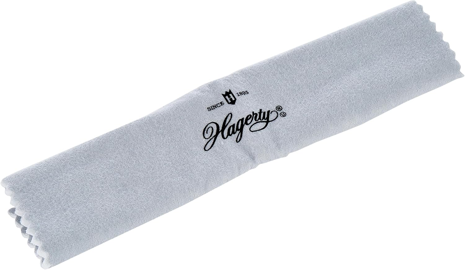100% Cotton Made in the USA or Imported Cloth to clean and polish gold, silver or platinum jewelry Features a white, inner cloth that leaves a long lasting tarnish-preventive barrier Features a grey, outer cloth to gently polish and buff your jewelry to a brilliant luster Compact size fits in a handbag or travel bag No-mess handling when cleaning jewelry The Hagerty Jewelry Polishing Cloth is specially designed to quickly and efficiently clean and polish all gold, silver, and platinum necklaces, bracelets, rings, chains and all fine jewelry. The white inner cloth is treated with a special formula that is gentle yet thorough in cleaning and buffing away tarnish, grime, fingerprints, body oils and cosmetics from all precious metals while at the same time imparting a tarnish resistant barrier. The gray outer cloth is an excellent buffer to be used after cleaning with the white cloth to heighten your jewelry's luster and brilliance. . 12" by 15"