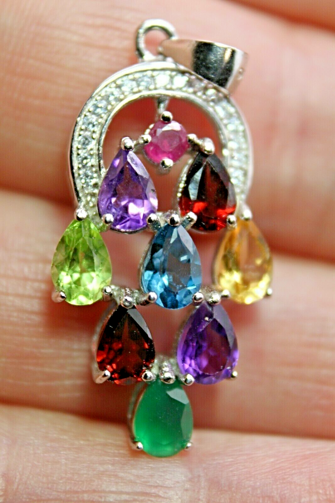 Solid sterling silver 925 stamped white gold coated pendant featuring pear cut faceted genuine natural mined gemstones each measuring 6mm x 4mm in a rainbow of colours - purple amethyst, heated london blue topaz, golden citrine, red garnet, green aventurine and green peridot with a 3mm x 3mm round cut faceted genuine natural mined heated pink ruby gemstone. The crescent at the top of the gemstones is encrusted with bright white round cut faceted 1.2mm x 1.2mm lab created zircon stones. The pendant measures 42mm x 12mm including bale and comes with a free 45.7cm 18 inch chain. GIFT BOXED Thanks for looking and please take time to view my other listings #4025/4036/4214