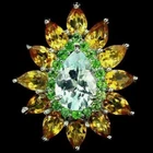Solid sterling silver 925 stamped white gold coated ring in a cluster design featuring a pear cut faceted genuine natural mined heated blue topaz gemstone measuring 12mm x 8mm surrounded by a row of genuine natural mined green chrome diopside gemstones each measuring 2mm x 2mm which are then surrounded by pear cut faceted genuine natural mined golden citrine gemstones each measuring 6mm x 4mm. The face of the ring measures 29mm x 24mm and it is a size O (US 7.25). GIFT BOXED Thanks for looking and please take time to view my other listings #11390