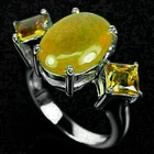 Solid sterling silver 925 stamped white gold coated ring featuring an unusual genuine natural mined oval cabochon yellow opal gemstone measuring 14 m m x 10 mm with a 4mm x 4mm square cut genuine natural mined golden citrine gemstone on each shoulder. The face of the ring measures 15mm x 14mm and is a size M 1/2 US 6.5 . GIFT BOXED Thanks for looking and please take time to view my other listings