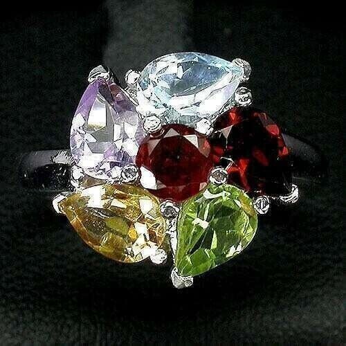 Solid sterling silver 925 stamped white gold coated cluster multigem ring featuring 7mm x 5mm pear cut faceted genuine natural mined gemstones in golden yellow citrine, green peridot, red garnet, purple amethyst and heated blue topaz with a further 5mm x 5mm round cut faceted red garnet gemstone in the centre. The face of the ring measures 15mm x 15mm and it is size S (US 9.5). GIFT BOXED Thanks for looking and please take time to view my other listings #1548