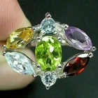 Solid sterling silver 925 stamped white gold coated ring featuring 8mm x 4mm marquise, 8mm x 6mm oval and 3mm x 3mm round cut faceted genuine natural mined gemstones in purple amethyst, red garnet, golden citrine, green peridot and heated blue topaz. The face of the ring measures 23mm x 18mm and it is a size P (US 7.75). GIFT BOXED Thanks for looking and please take time to view my other listings #882