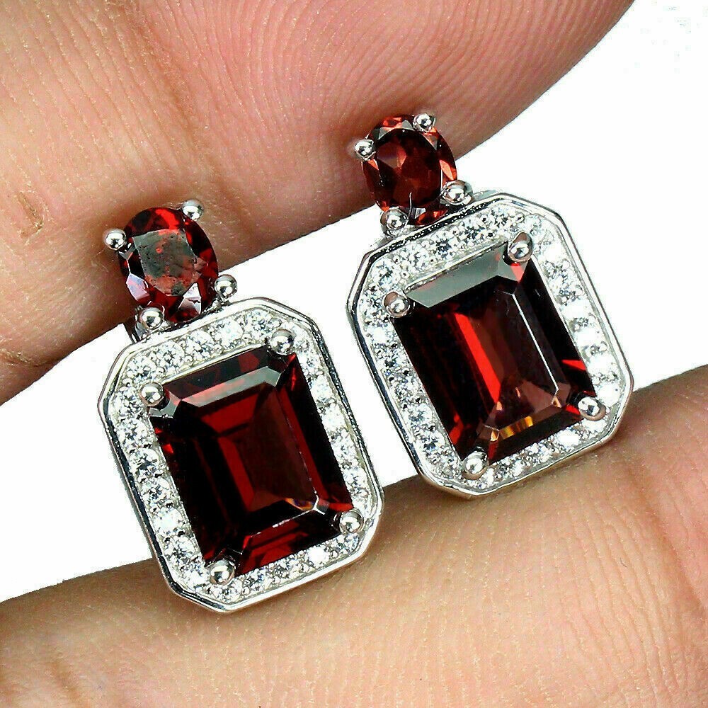 Solid sterling silver 925 stamped white gold coated earrings featuring a central emerald cut faceted genuine natural mined red garnet gemstone measuring 9mm x 7mm set into a border of bright white round cut faceted lab created zircon stones each measuring 1mm x 1mm and with a further 5mm x 4mm oval cut faceted red garnet gemstone set above. The earrings measure 18mm x 12mm and have a leverback fastening. GIFT BOXED Thanks for looking and please take time to view my other listings #16490 / 16559