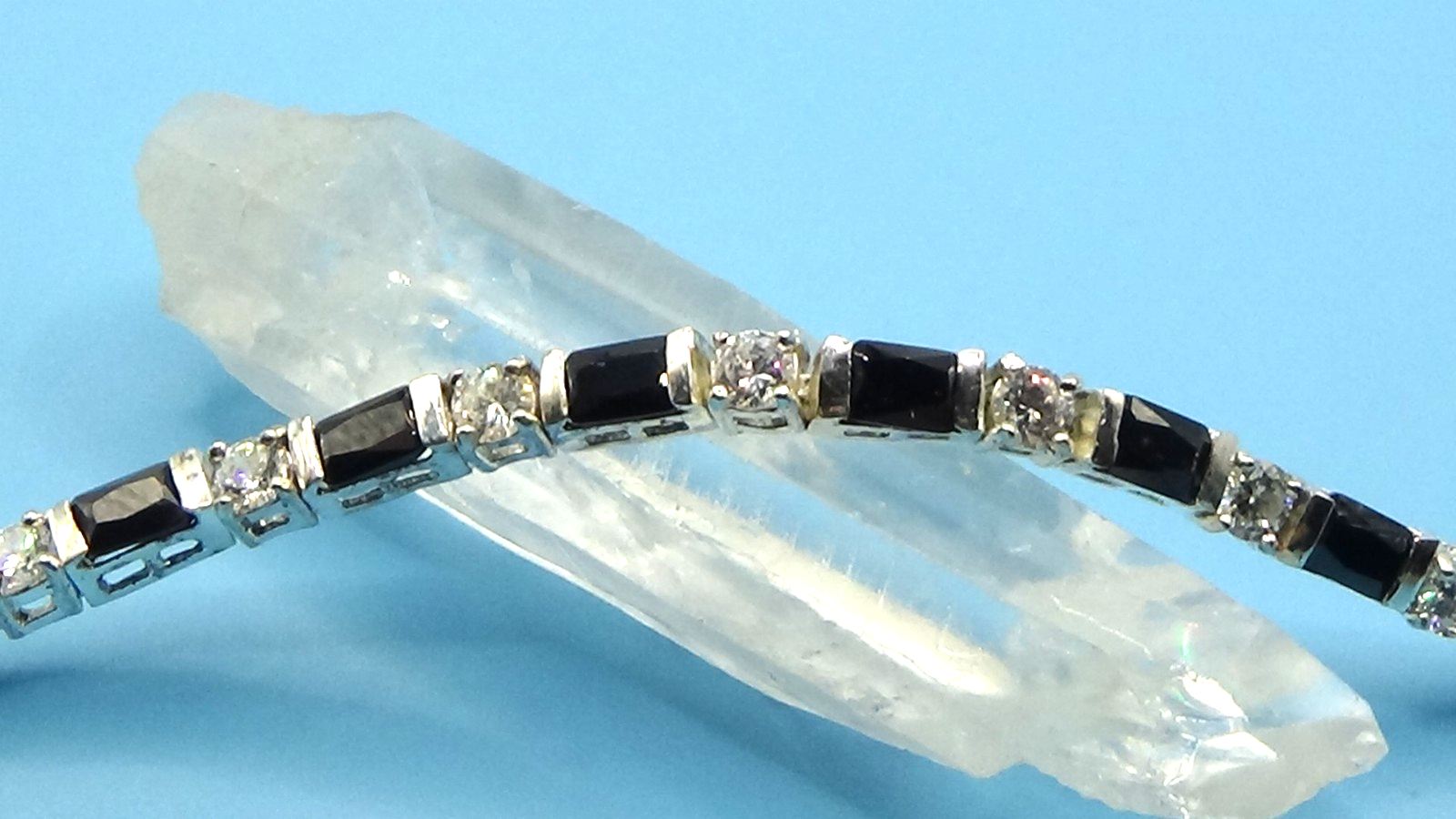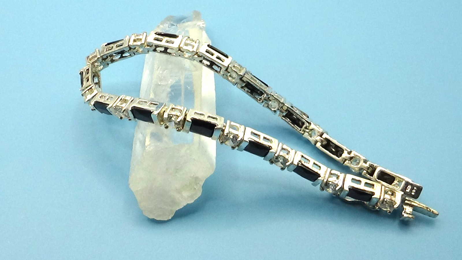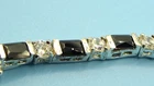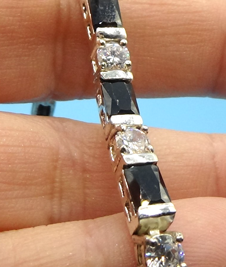 This is a Verry Elegant Sterling Silver Tennis Bracelet W/ Alternating Clear & Black Baguette-cut Stones. This piece measures 7.5" inches long and 4.5mm wide with a height of 4mm. This bracelet is marked FAS 925. Note: Some pictures are taken close up to show detail. Please consider saving me as a favorite seller...Thanks and have a wonderful day!
