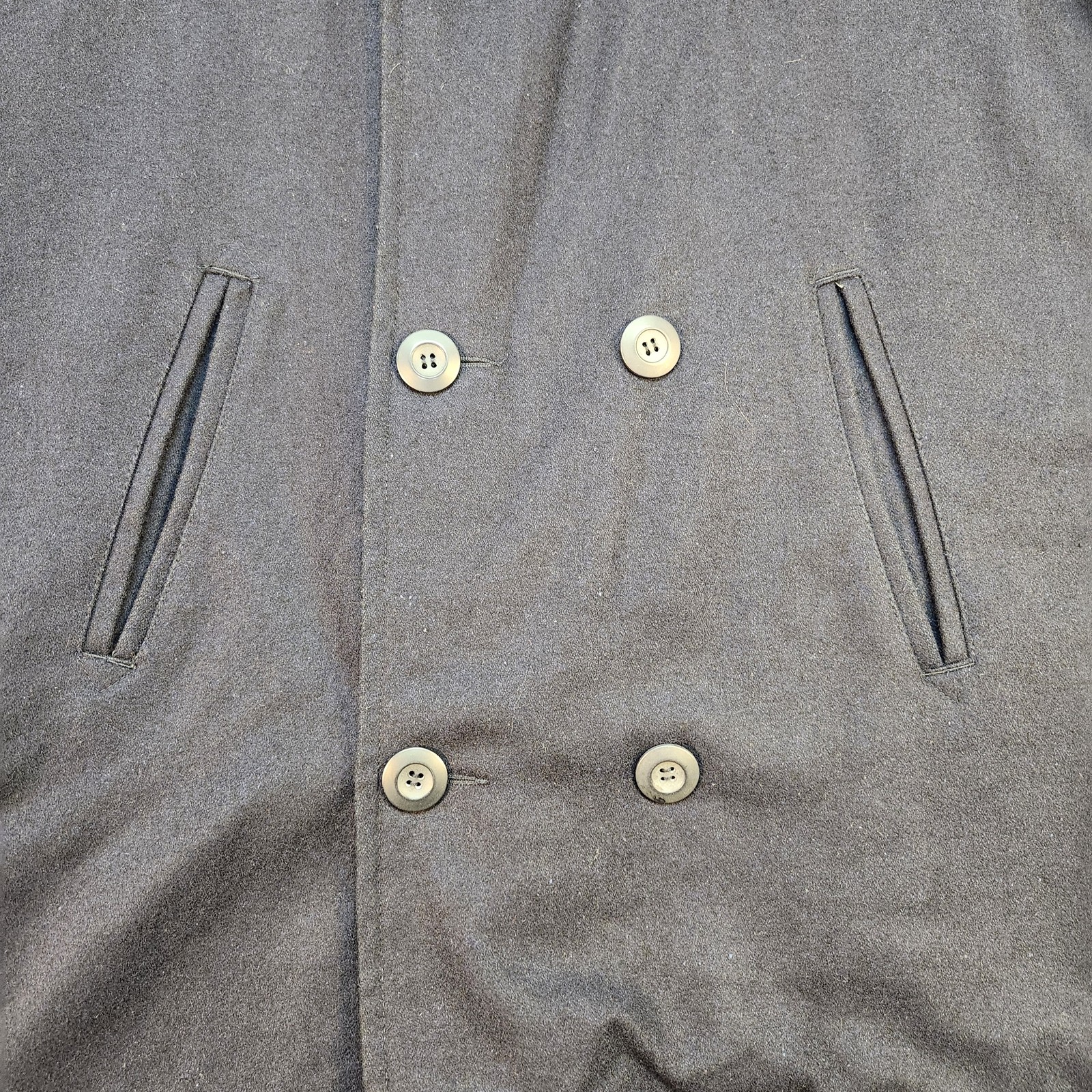 Steve & Barry's The Woolly Mammoth Jacket Mens Large Navy Blue Peacoat Condition: Good pre-owned condition, light general wear, no major flaws or stains visible Double breasted front with six buttons for closure Quilted interior lining for added warmth and comfort Materials: Shell 65% polyester, 25% wool; Lining 100% polyester; Filling 100% polyester Color: Navy blue Two front vertical slit hand pockets Tag size: Large (Mens) Approximate measurements: Length 33.5 inches, Sleeve 26.5 inches from shoulder Classic peacoat style, versatile for casual or dressy wear Brand and labels clearly marked inside Made in China Timeless cooler weather outerwear