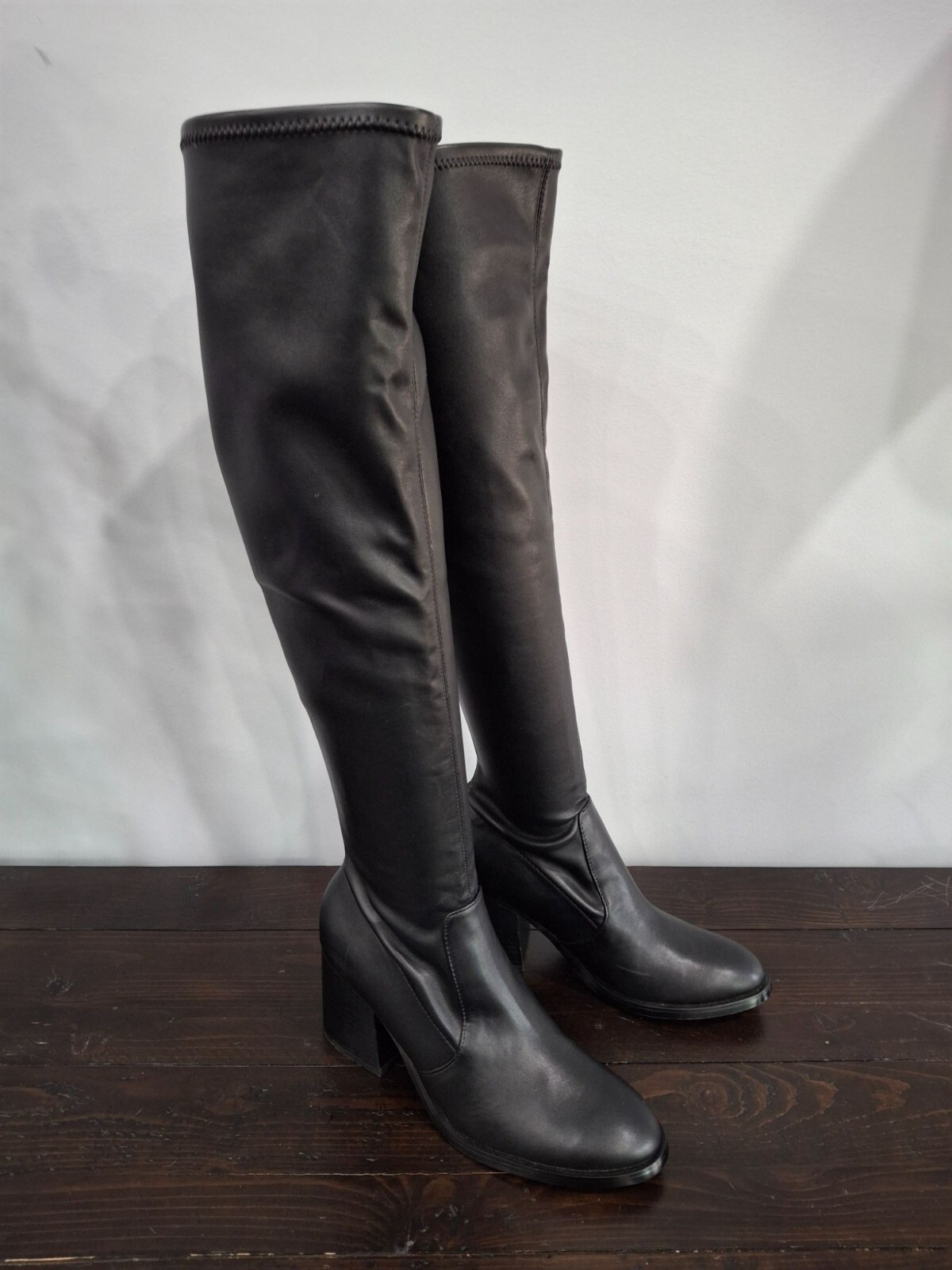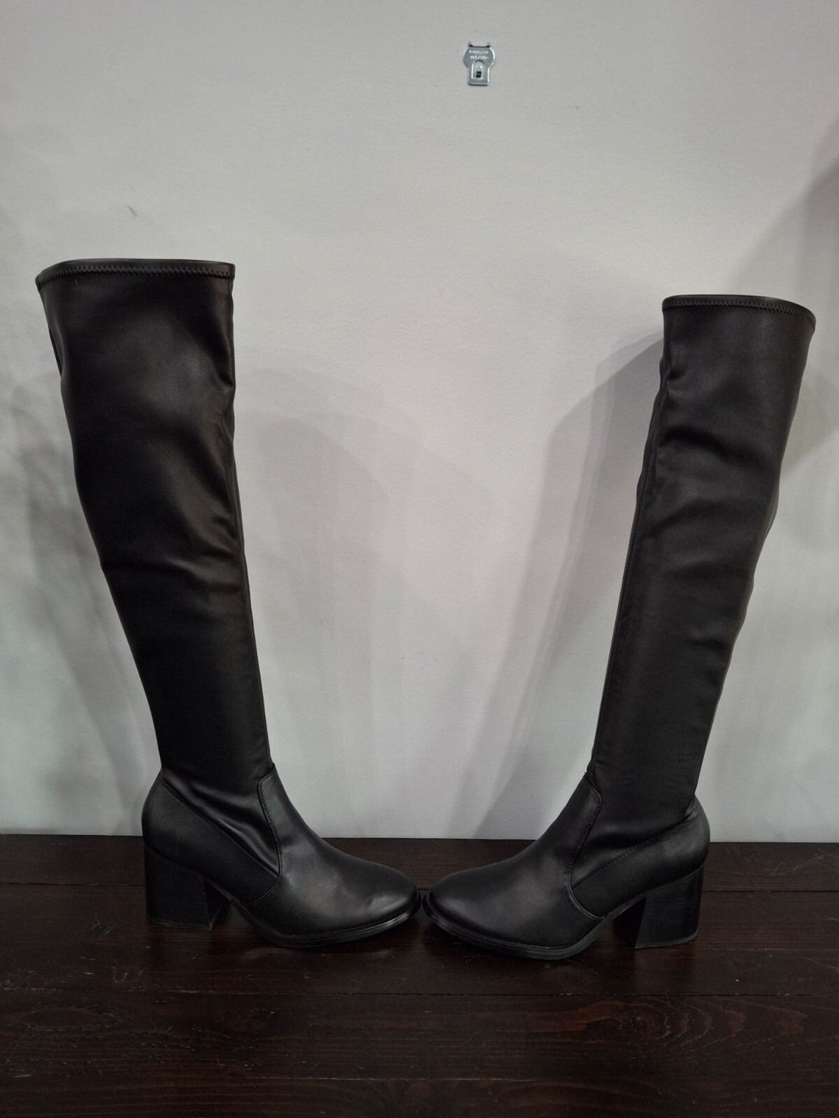 NWOB! Size 9M MSRP $150 Description ~ Round Toe ~ Padded Footbed for xtra comfort ~ Stretchy for a defining fit (not for a wide calf) ~ Easily Spot clean Measurements are approximate (See photos) ~ 3 inch Block Heel ~ 7 inch shaft laying flat - 14 inch shaft circumference ~ 22 inch Total Height Material ~ Synthetic Rubber Sole ~ Synthetic lining and insole