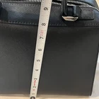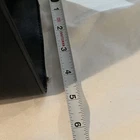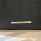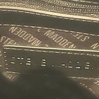 This is a black Steve Madden handbag with a scarf accent and a removable strap. The bag has a square shape and a zip closure. It is 8”H, 9”W, and 4.5”D in size and has double handles with a removable shoulder strap. The lining is black fabric, and the hardware color is silver. The bag is made of polyester cloth and has accents including a strap, bow, zipper, and logo. It is a small satchel, crossbody, and handbag in style and has features such as being lined, having inner pockets, and being adjustable.