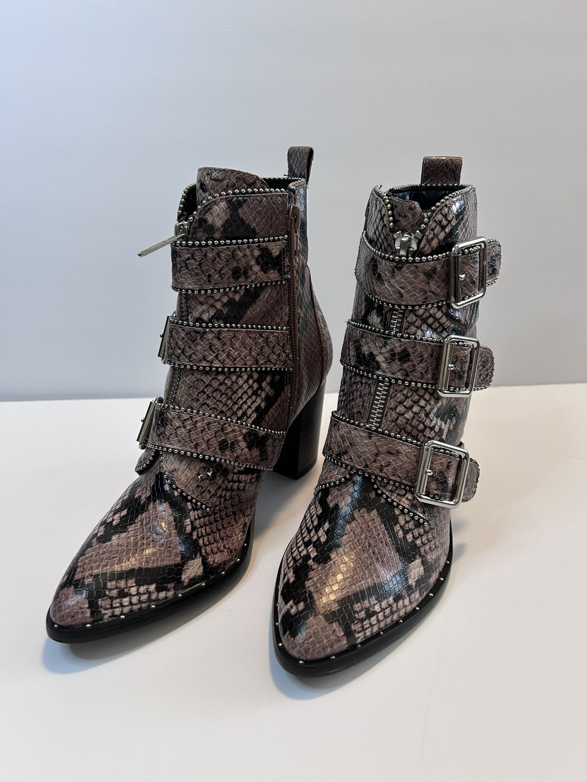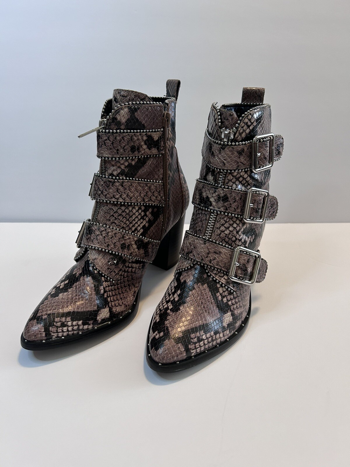 Elevate your style statement with these chic Steve Madden boots. Crafted with synthetic snakeskin upper material, these low top booties feature almond toe shape and zip closure. The multicolor animal print pattern adds a touch of wildness to your wardrobe, while the high block heel measuring 3-3.9 inches gives you the perfect lift. The studded straps and accents make these boots stand out in the crowd, making them perfect for any occasion. These women's boots are available in size 7 and are sure to be a valuable addition to your shoe collection. Size 7 Zipper closure Heel around 3” Pls check left boot has some scratches on back !!!