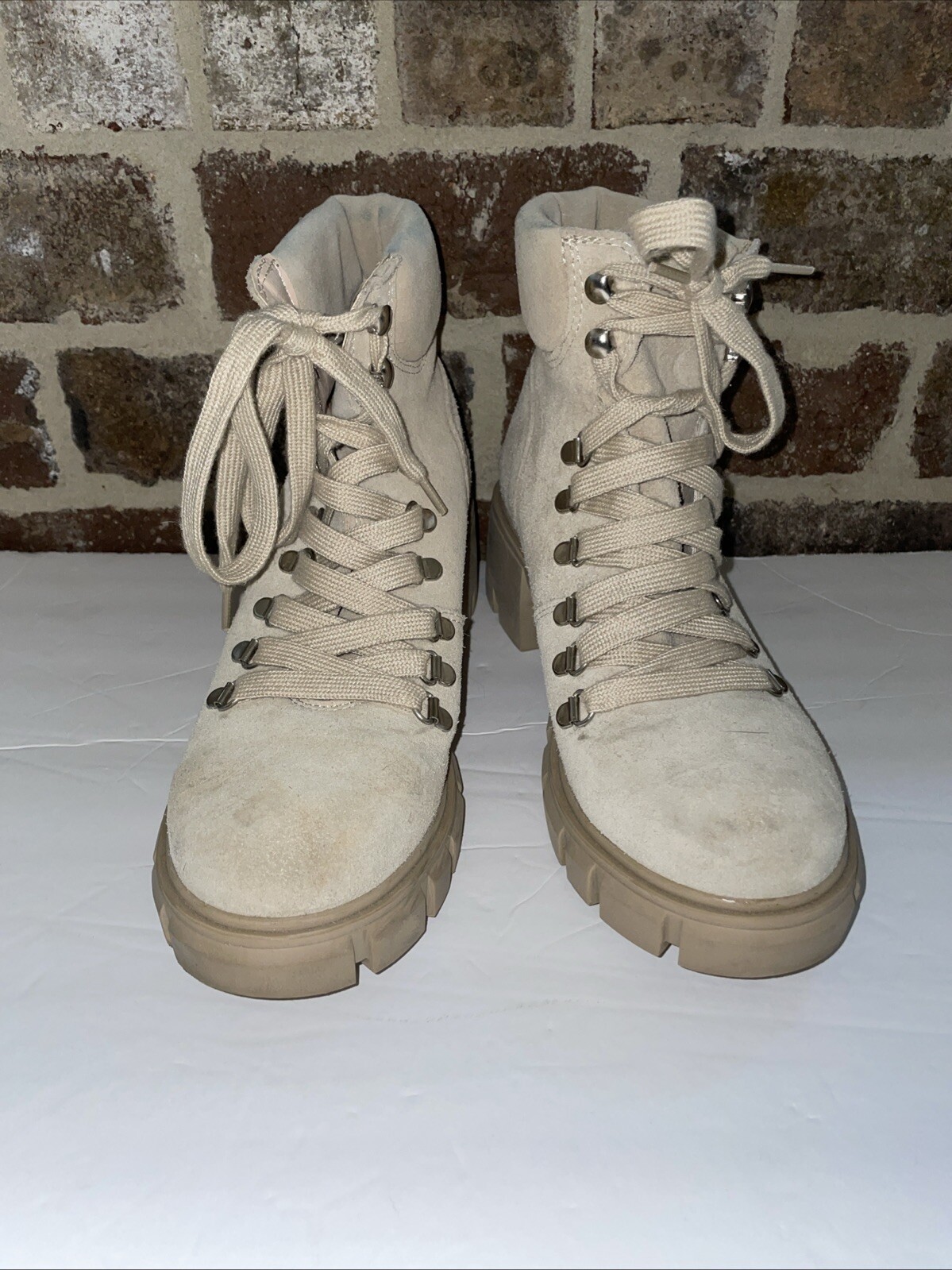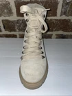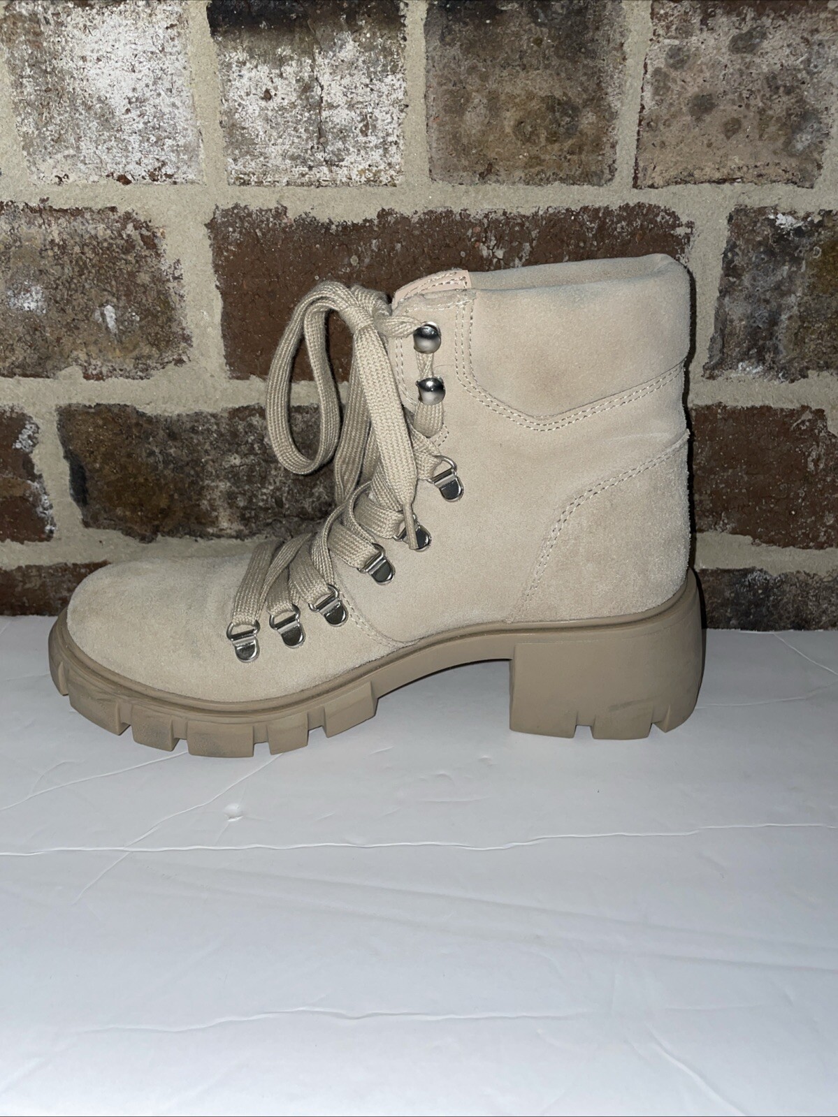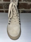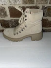 *some scuffs and not in perfect condition but in overall very good condition These Steve Madden Hint boots are designed for versatile wear, suitable for travel, activewear, parties, casual outings, formal occasions, work settings, and business meetings. The sand tan suede boots feature a round toe shape, mid heel height, lace accents, and a block heel style. The leather lining and adjustable features provide comfort and practicality, while the rubber outsole ensures traction. With a combat style, these boots add a trendy edge to any outfit, making them a stylish and functional choice for various occasions.